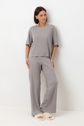 Комплект из объемного трикотажа с добавлением эластичных волокон. Свободный силуэт, мягкий пояс и отсутствие боковых швов на брюках обеспечат комфорт во время сна и отдыха.