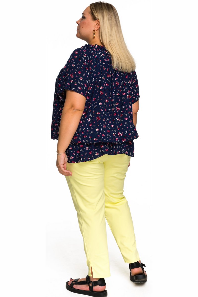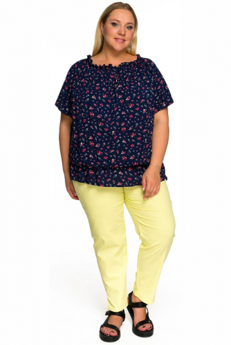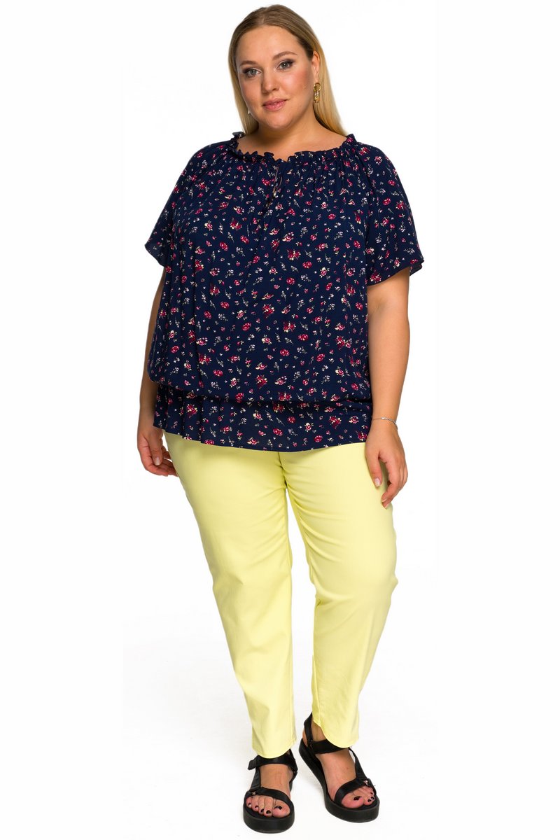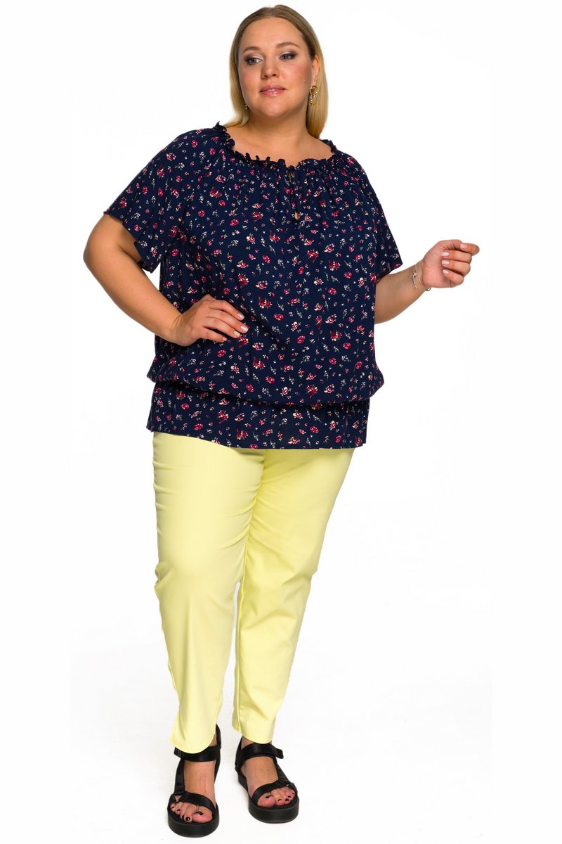 Туника из принтованого штапеля свободного силуэта. Рукав на основе реглан. Линия горловины расширена, на резинке, за счет чего можно приоткрыть плечи. На уровне линии талии напуск, зафиксированный резинкой.