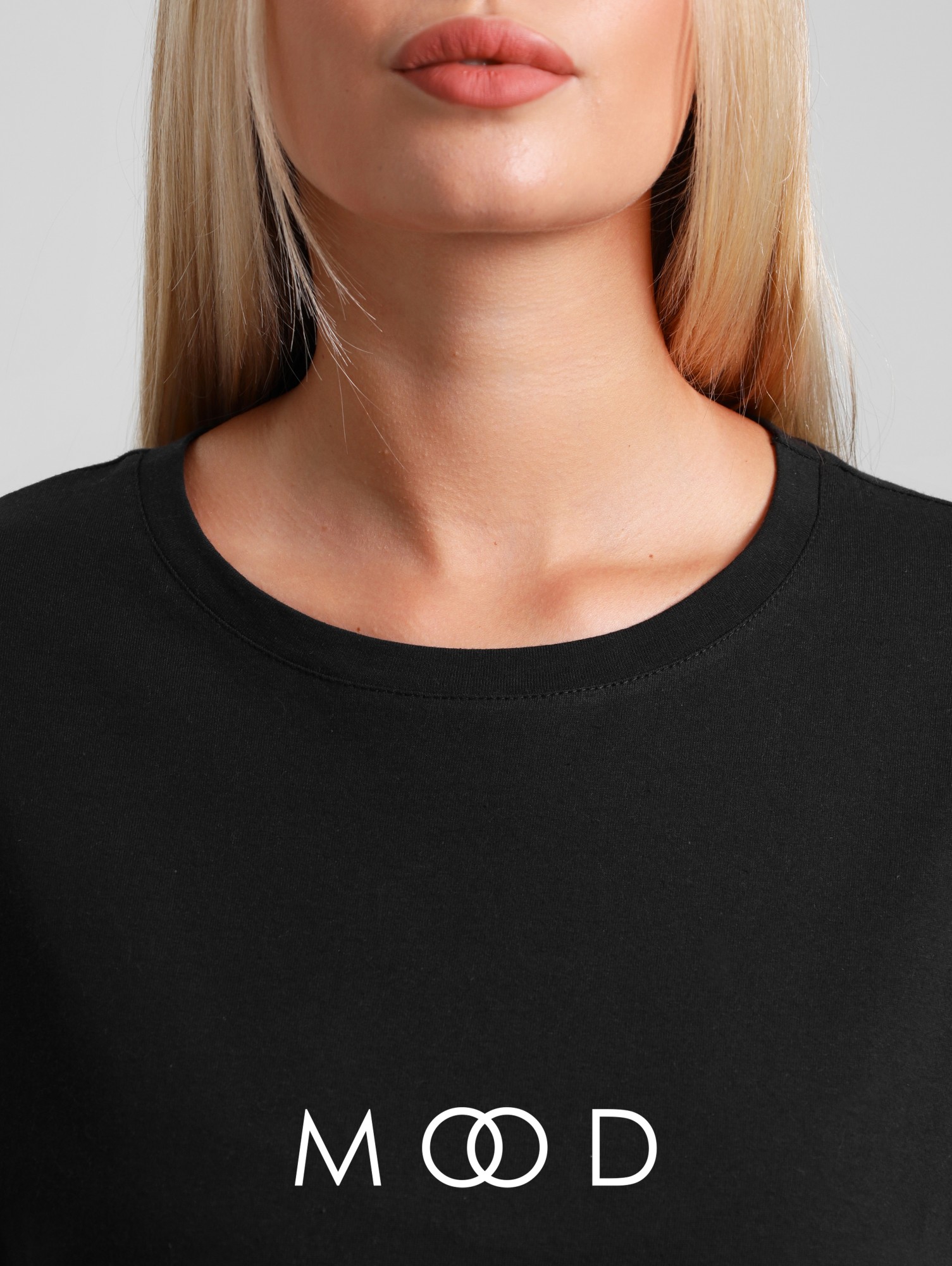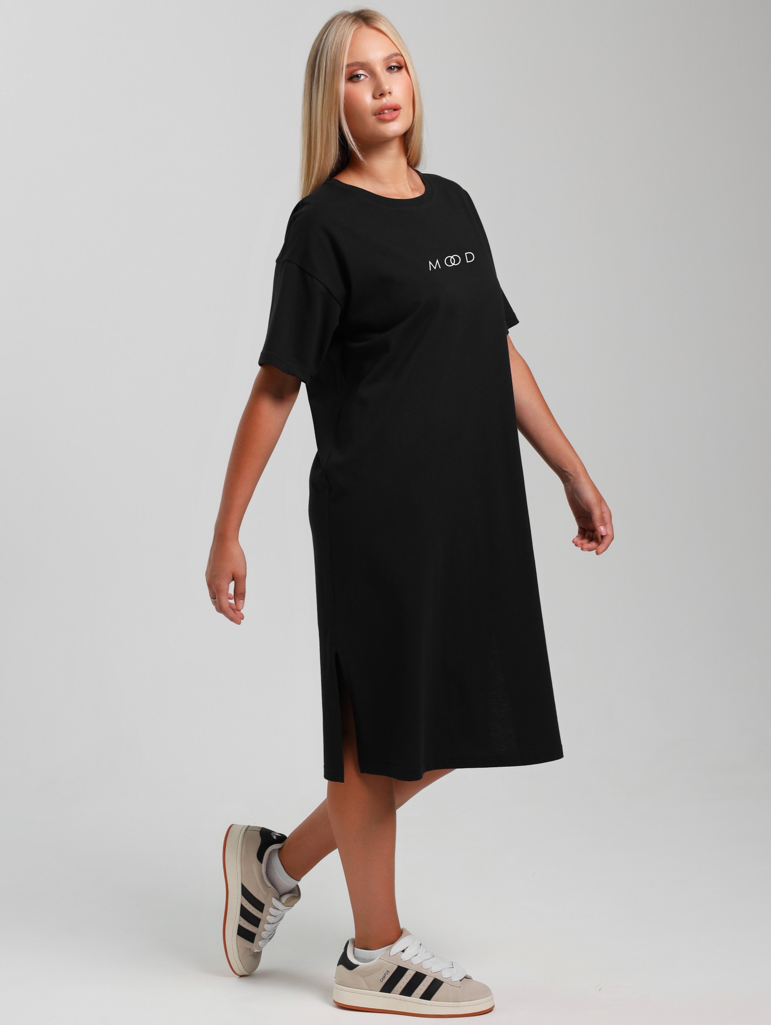 Туника молодежная из гладкокрашенного полотна «кулирка», свободного покроя, с короткими втачными рукавами, горловиной овальной формы, обработанной притачной бейкой и разрезами в боковых швах. На полочке выполнен принт в технике «шелкографии».