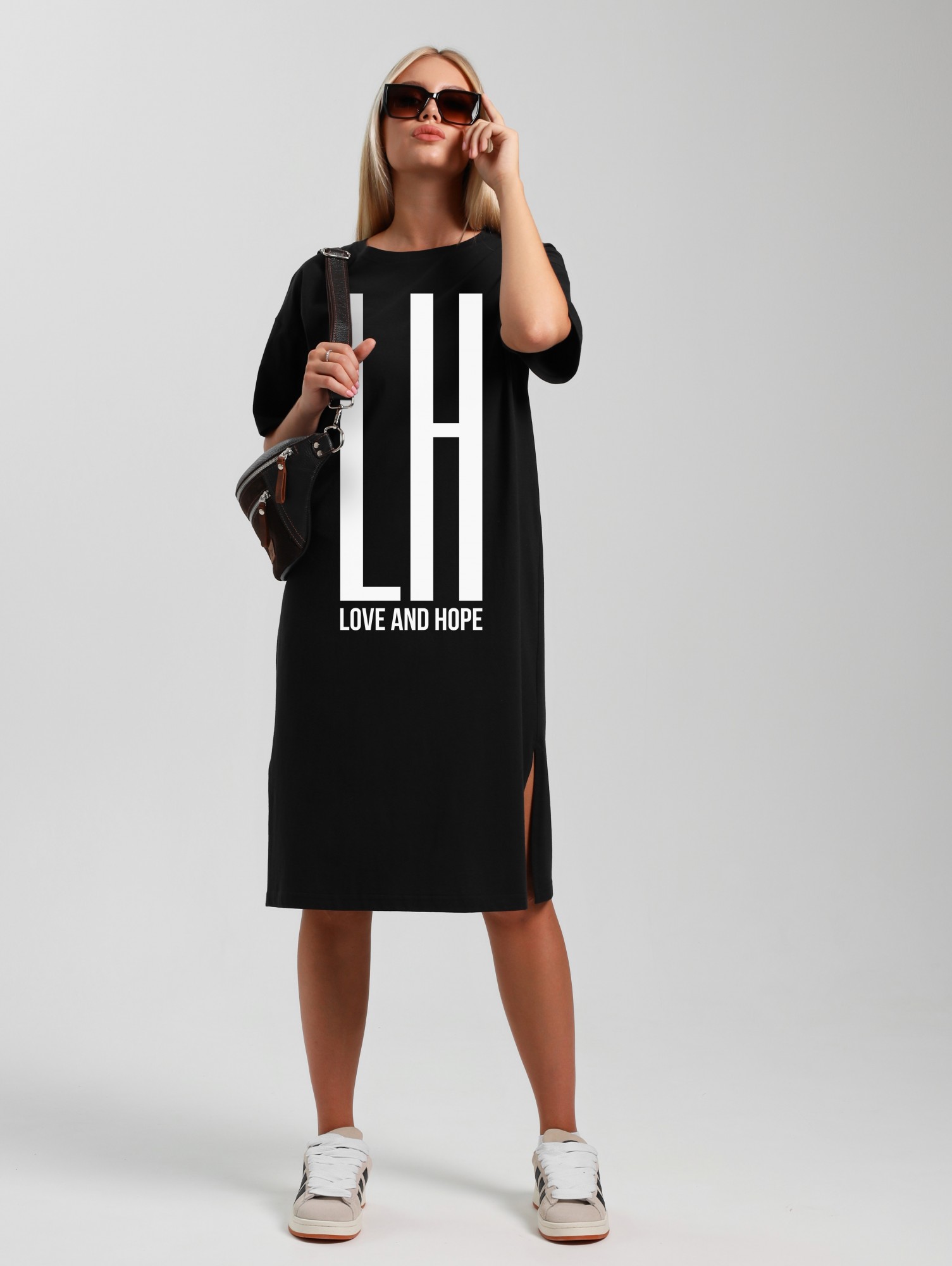 Туника молодежная из гладкокрашенного полотна «кулирка», свободного покроя, с короткими втачными рукавами, горловиной овальной формы, обработанной притачной бейкой и разрезами в боковых швах. На полочке выполнен принт в технике «шелкографии».
