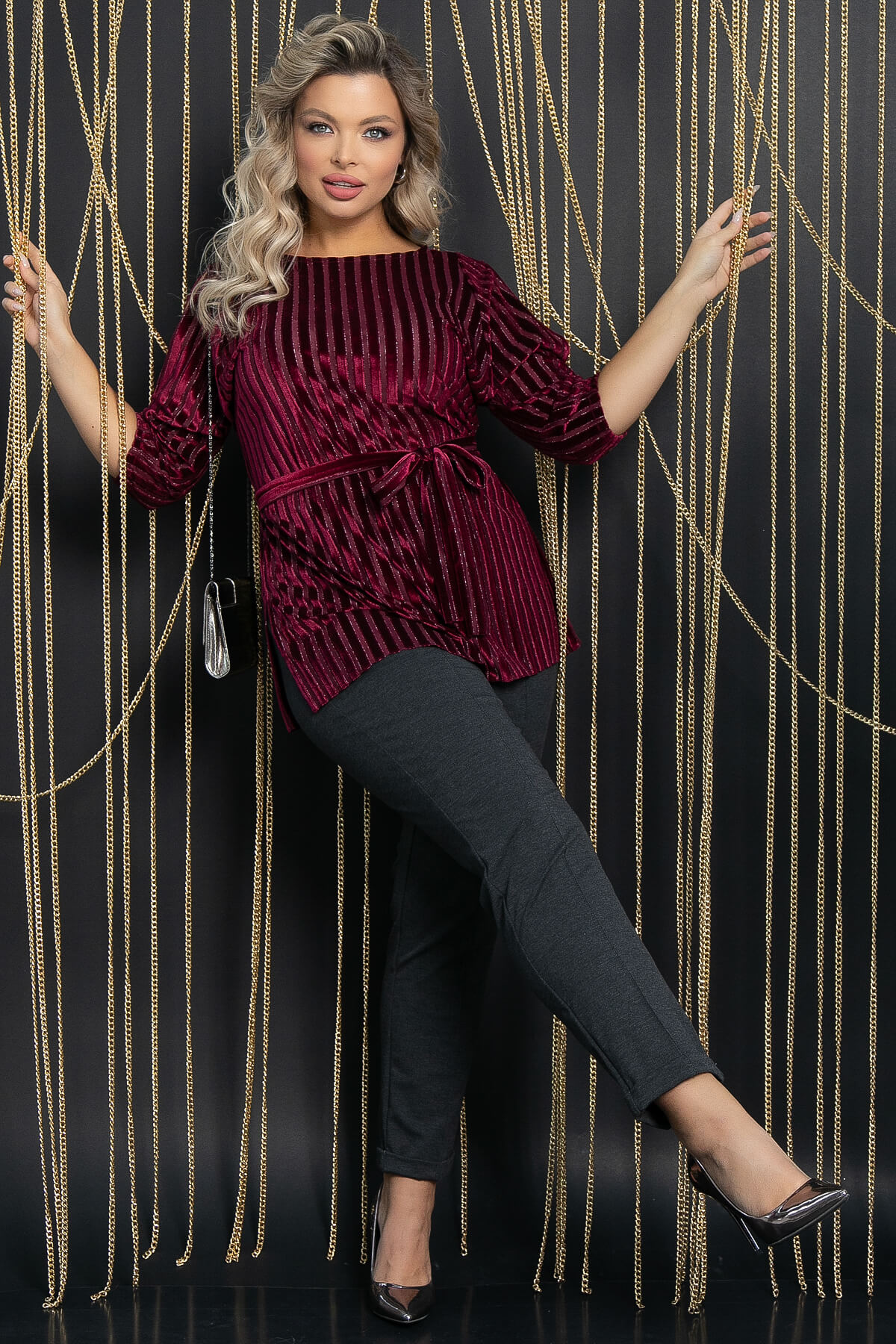 Туника для создания стильного праздничного образа. Такая модель будет интересно смотреться в сочетании с прилегающим низом. Украшением модели служат рукава с вырезами, которые и не открывают полностью руку, и слегка приоткрывают плечи. По бокам туники есть разрезы, в комплект входит пояс из основной ткани.