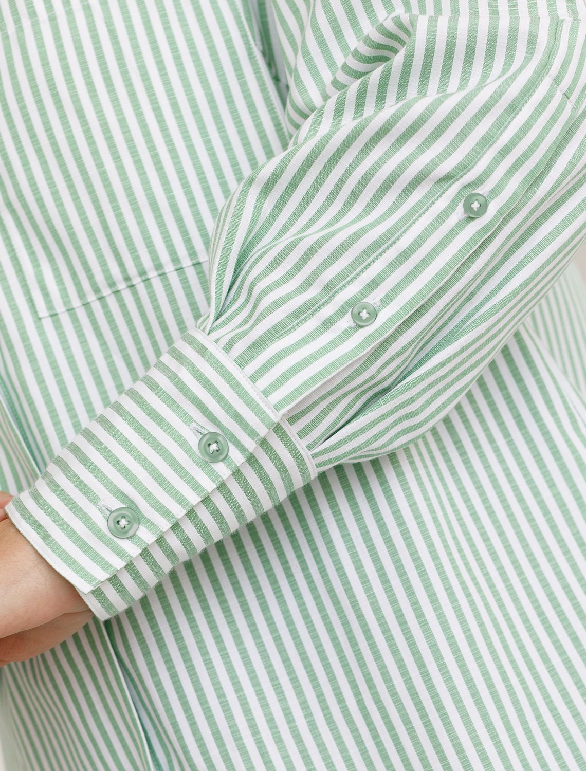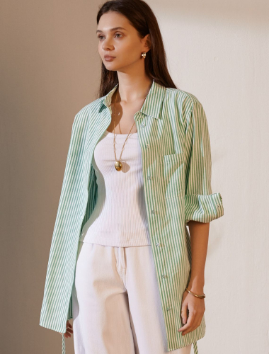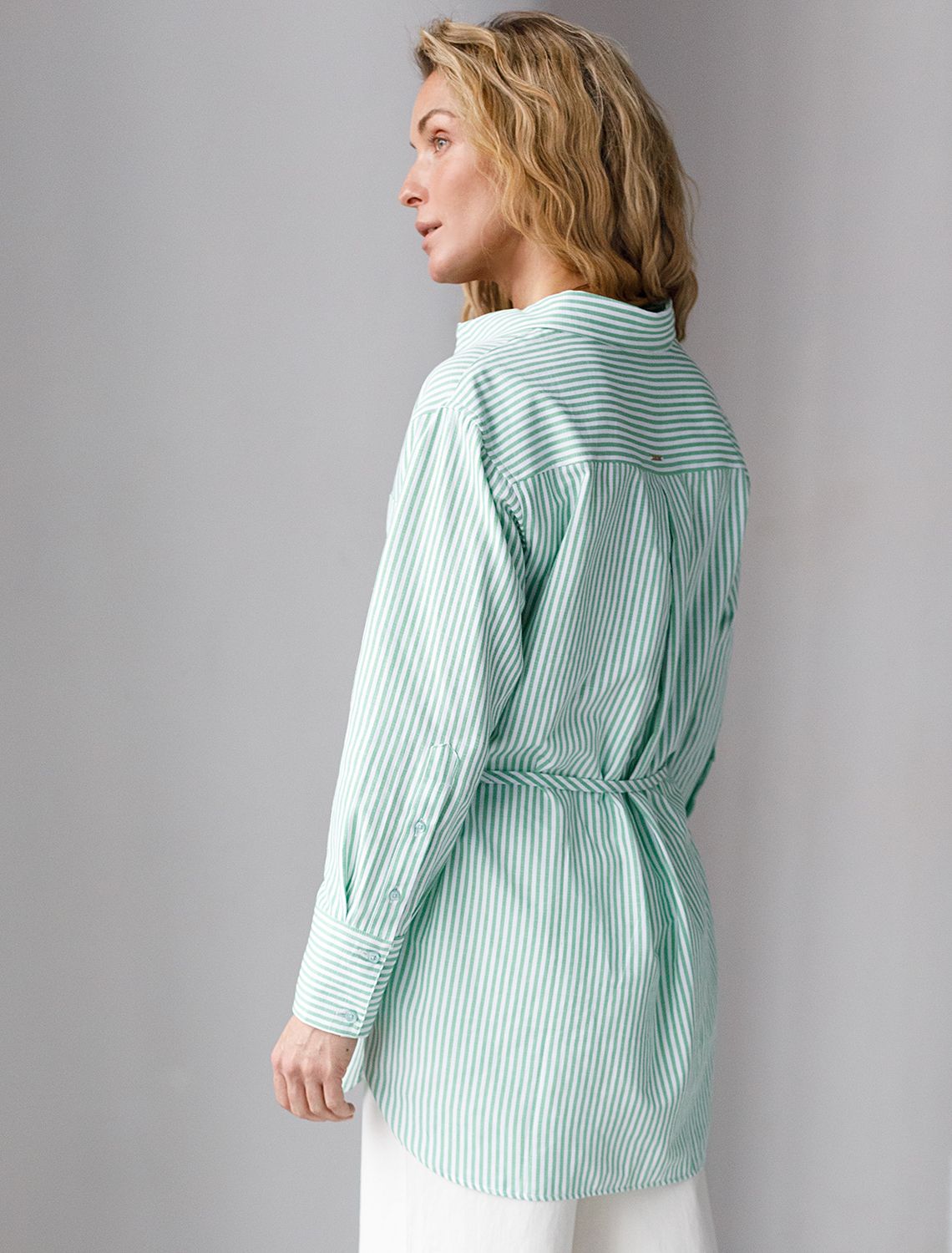 Женственная удлиненная блузка белого цвета в тонкую фисташковую полоску прекрасно освежает повседневный образ благодаря нежной расцветке. Натуральный хлопок обеспечивает деликатное прилегание, хорошую воздухопроницаемость, не сковывает движений и подходит для долгого ношения. Благодаря поясу классическую рубашку можно приталить, создавая красивый силуэт, где выгодно подчеркнутся достоинства фигуры и добавится изящества образу. Удлиненный крой рубашки поможет скрыть возможные недостаки фигуры, при этом выглядеть стильно. Отложной воротник и манжеты придают блузке аккуратный и завершенный вид. Принт в тонкую полоску добавляет динамику и легкость, такая блузка остается актуальной вне зависимости от сезона. Повседневная длинная блузка легко комбинируется с различными низами и поможет создать расслабленный или элегантный образ в зависимости от выбранных аксессуаров.