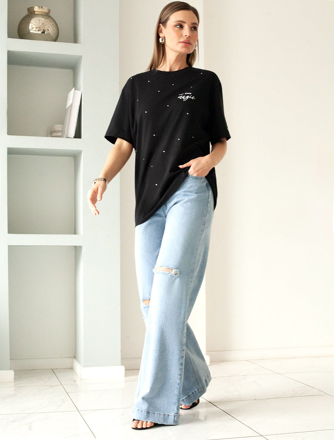 Удлиненная футболка over-size с принтом стразами D49.978 черный_own your magic