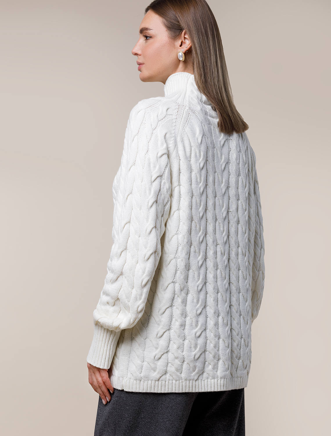 Свитер выполнен из мягкой хлопковой пряжи фактурной вязки с добавлением акрила. Удлиненная модель силуэта over-size с воротом-стойка и узором косы во всю длину. Хорошо поддерживает тепло, при этом не перегревая тело. Сохраняет первоначальный внешний вид даже после множества стирок. Свободный силуэт позволяет носить изделие на футболку или рубашку с любым низом. Из украшений металлический логотип бренда. натуральный белый