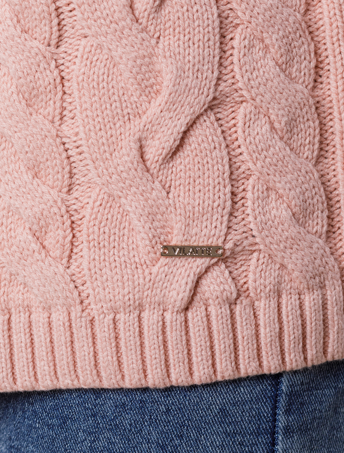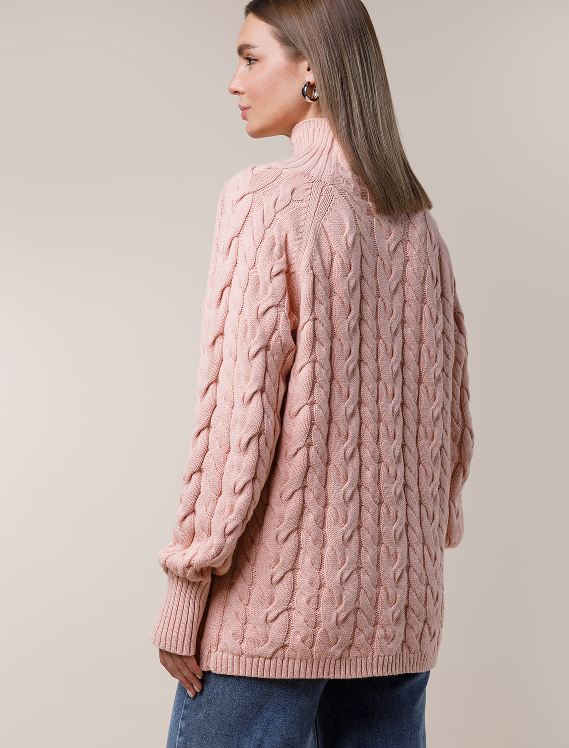 Свитер выполнен из мягкой хлопковой пряжи фактурной вязки с добавлением акрила. Удлиненная модель силуэта over-size с воротом-стойка и узором косы во всю длину. Хорошо поддерживает тепло, при этом не перегревая тело. Сохраняет первоначальный внешний вид даже после множества стирок. Свободный силуэт позволяет носить изделие на футболку или рубашку с любым низом. Из украшений металлический логотип бренда. пудровый
