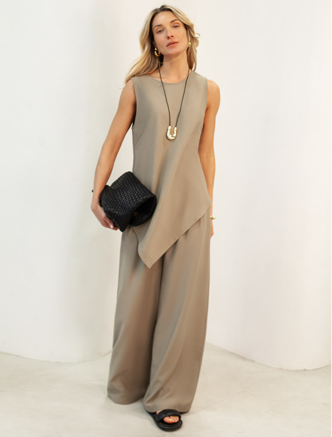 Топ выполнен из плотного лиоцелла. Ткань изделия отлично держит форму, плавно драпируется и не просвечивает. В теплое время года приятно охлаждает кожу. Добавление синтетических волокон в составе изделия, предотвращает сминаемостьи поддерживает формоустойчивость. Топ сочетается в костюме с брюками D24.261, D24.265, D24.267, юбкой D24.261, шортами D28.057, а также очень эффектно с белыми шортами и джинсами.