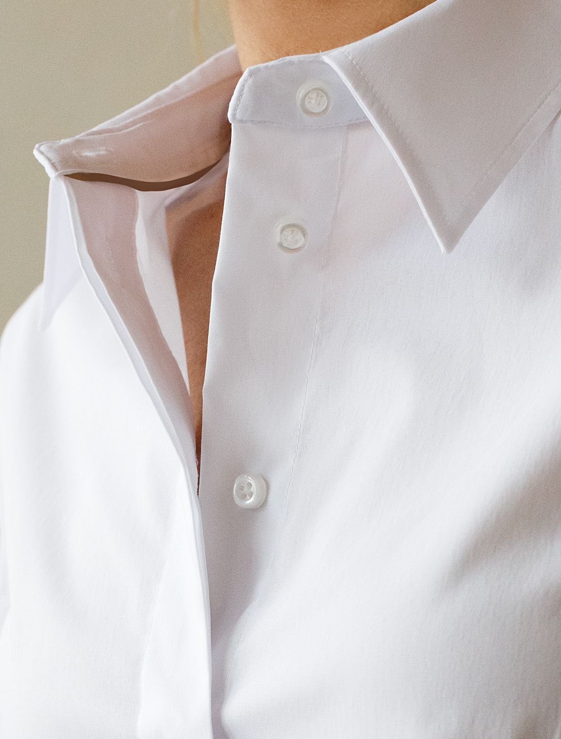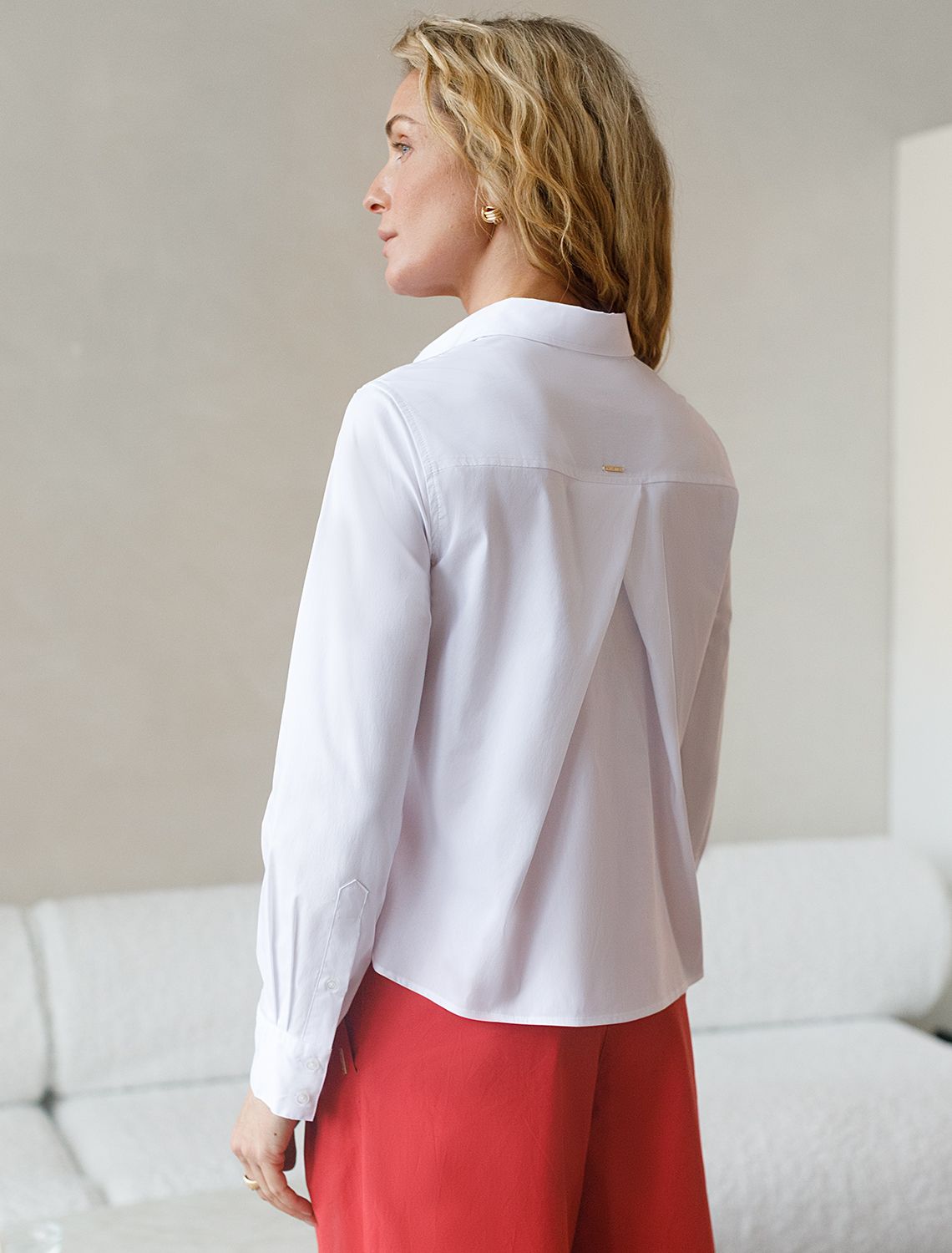 Стильная укороченная блузка белого цвета создана для комфорта в любой ситуации. Эластичный хлопок делает модель приятной для тела и хорошо дышащей, что особенно важно в течение долгого дня. Свободный крой не ограничивает движения, подходит на любую фигуру и гармонично смотрится в разных образах. Повседневная блузка держит форму даже после продолжительной носки, что помогает всегда выглядеть аккуратно. На спинке блузки расположена встречная бантовая складка с наклоном, что создаёт красивый визуальный эффект и придаёт дополнительный объем. Рукава обработаны широким манжетом на 2 пуговицы. Дополнительная пуговица на планке рукава не даёт раскрываться и топорщиться разрезу. Отложной воротник придает классический вид, подходящий для офисных будней. Особенно стильно рубашка смотрится в непринужденных, городских или повседневных комплектах.