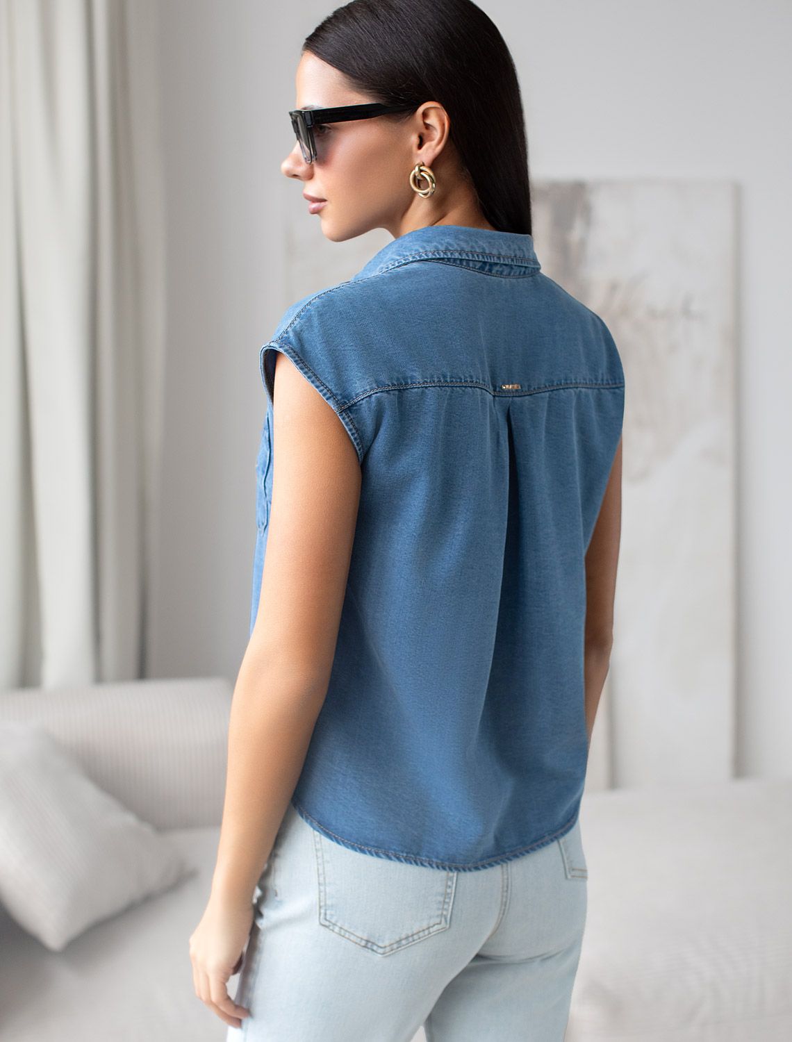 Укороченная блузка с коротким рукавом из джинсового лиоцелла D59.018 светло-синий