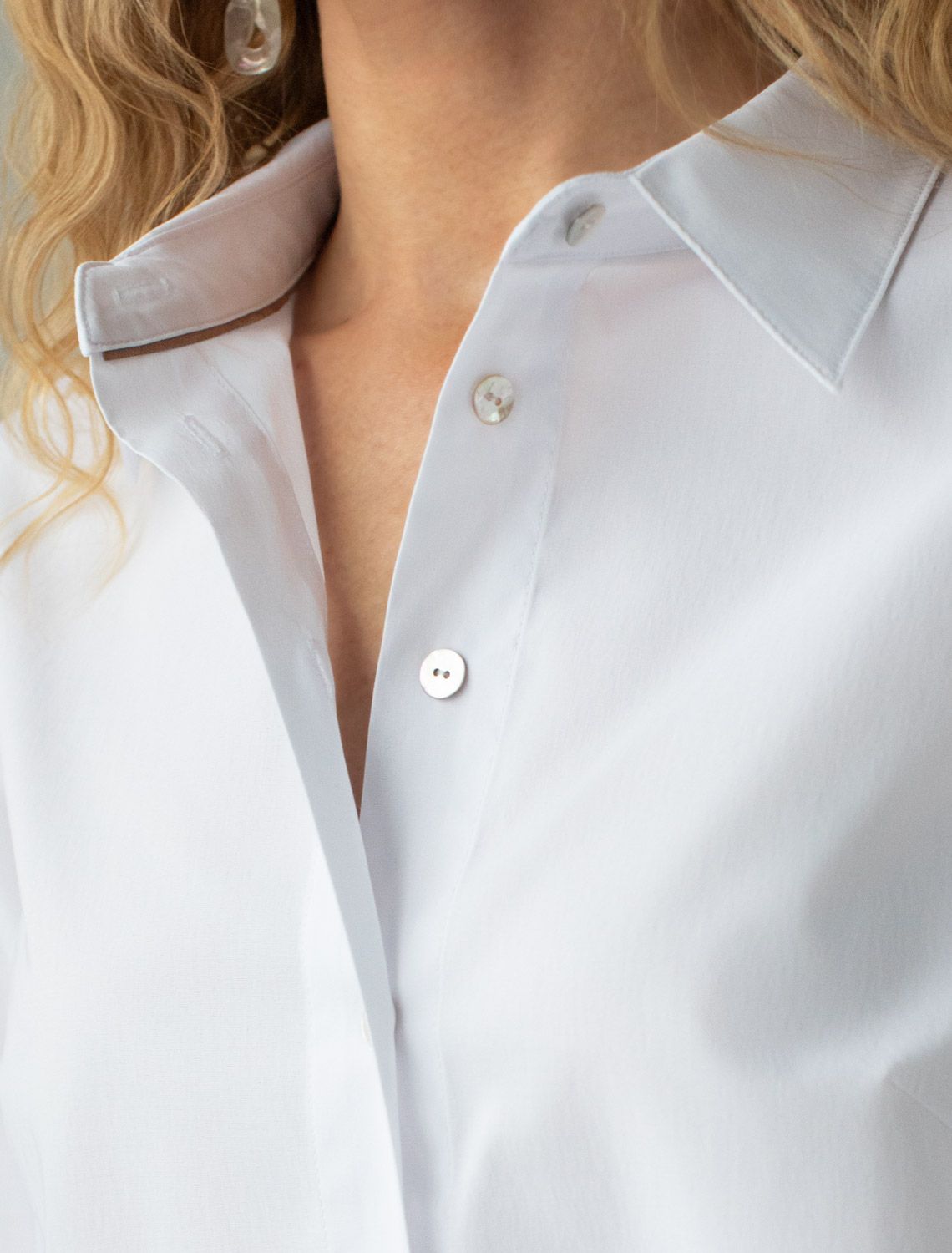 Укороченная блузка белого цвета из эластичного хлопка идеальна на весну и лето. Смешанный состав ткани идеален для деловых блузок: хлопок приятен к телу, полиэстер повышает долговечность, ПУ (эластан) придает комфортную растяжимость. Стильная модель с пышными рукавами буфами создает эффектный и женственный образ, который подойдет как для деловой работы, так и для повседневной носки. Блузка дополнена пуговицами из натурального перламутра — это экологичная долговечная фурнитура с уникальным сиянием. Практичная кулиска по низу держит форму изделия, подчеркивая талию и создавая аккуратный силуэт, а так же позволяет регулировать посадку, добавляя функциональности и удобства. Благодаря сочетанию качества материала и продуманного дизайна, рубашка хорошо сидит и на больших размерах, обеспечивая комфорт и свободу движений. Короткие рукава фонарики придают образу модный акцент, делая его более выразительным и динамичным. Натуральная ткань гарантирует комфорт и воздухопроницаемость, что особенно важно в теплое время года.