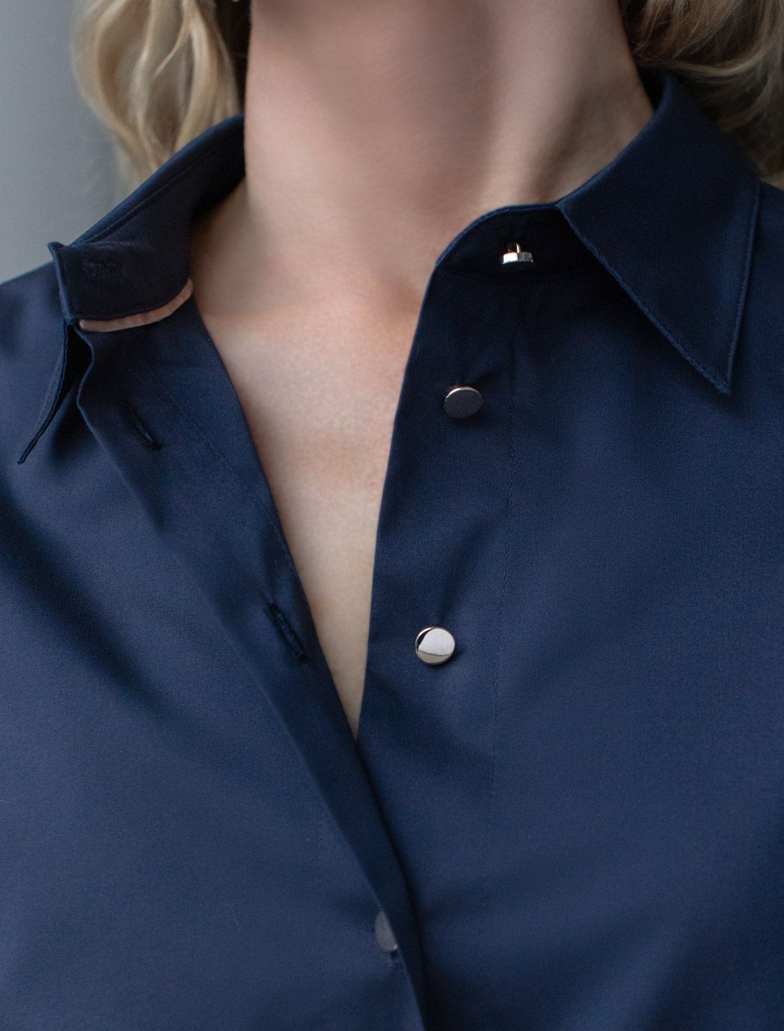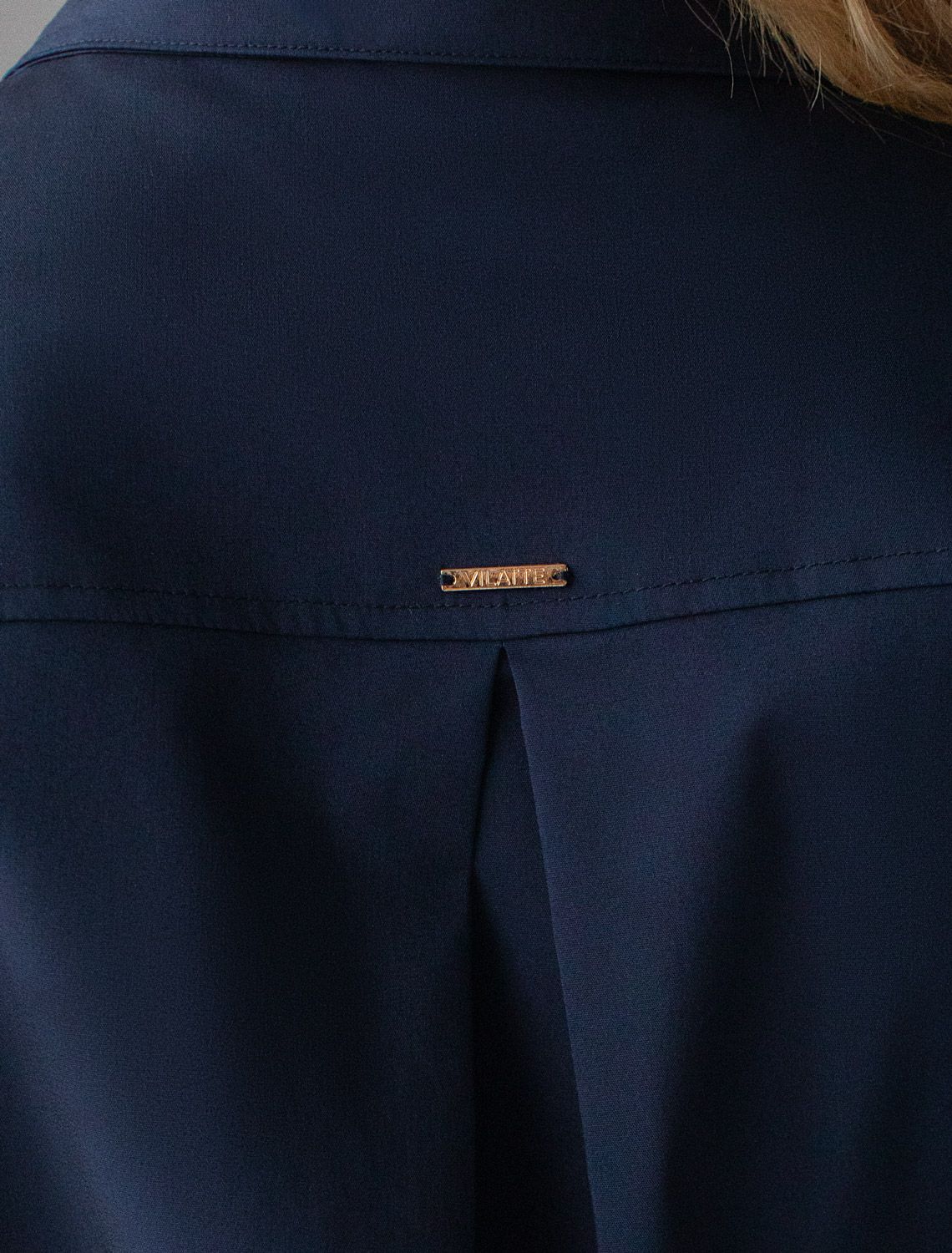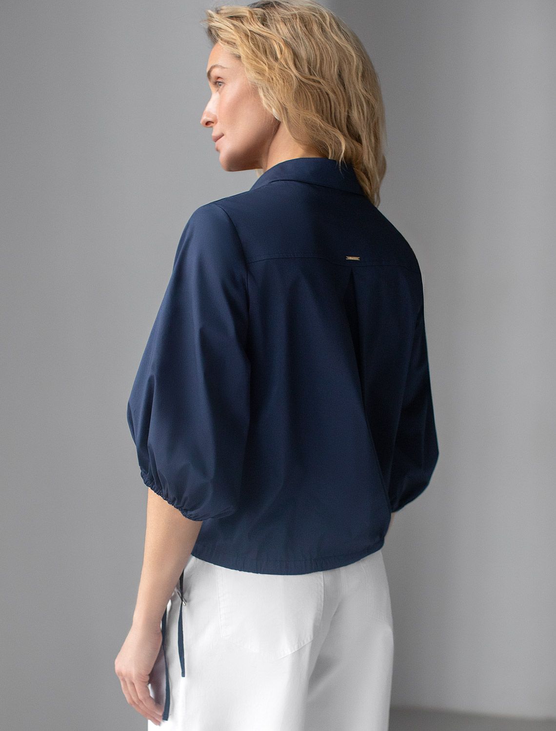 Укороченная блузка темно-синего цвета из эластичного хлопка идеальна на весну и лето. Смешанный состав ткани идеален для деловых блузок: хлопок приятен к телу, полиэстер повышает долговечность, ПУ (эластан) придает комфортную растяжимость. Стильная модель с пышными рукавами буфами создает эффектный и женственный образ, который подойдет как для деловой работы, так и для повседневной носки. Практичная кулиска по низу держит форму изделия, подчеркивая талию и создавая аккуратный силуэт, а так же позволяет регулировать посадку, добавляя функциональности и удобства. Блузка дополнена пуговицами из натурального перламутра — это экологичная долговечная фурнитура с уникальным сиянием. Благодаря сочетанию качества материала и продуманного дизайна, рубашка хорошо сидит и на больших размерах, обеспечивая комфорт и свободу движений. Короткие рукава фонарики придают образу модный акцент, делая его более выразительным и динамичным. Натуральная ткань гарантирует комфорт и воздухопроницаемость, что особенно важно в теплое время года.