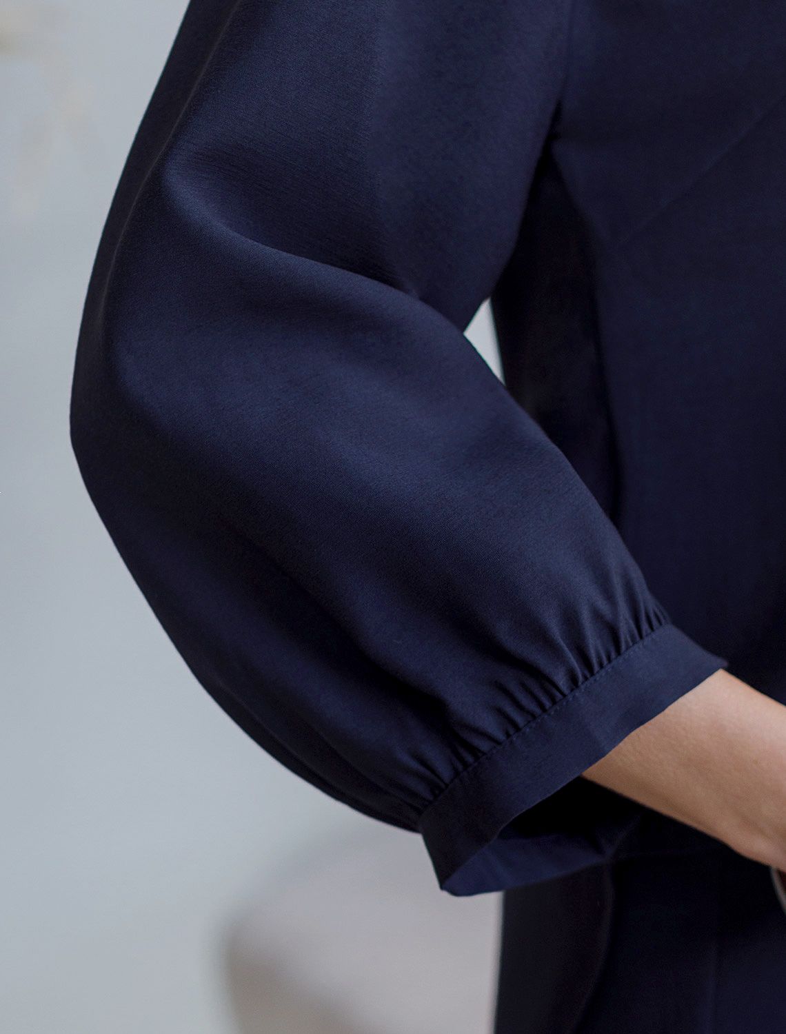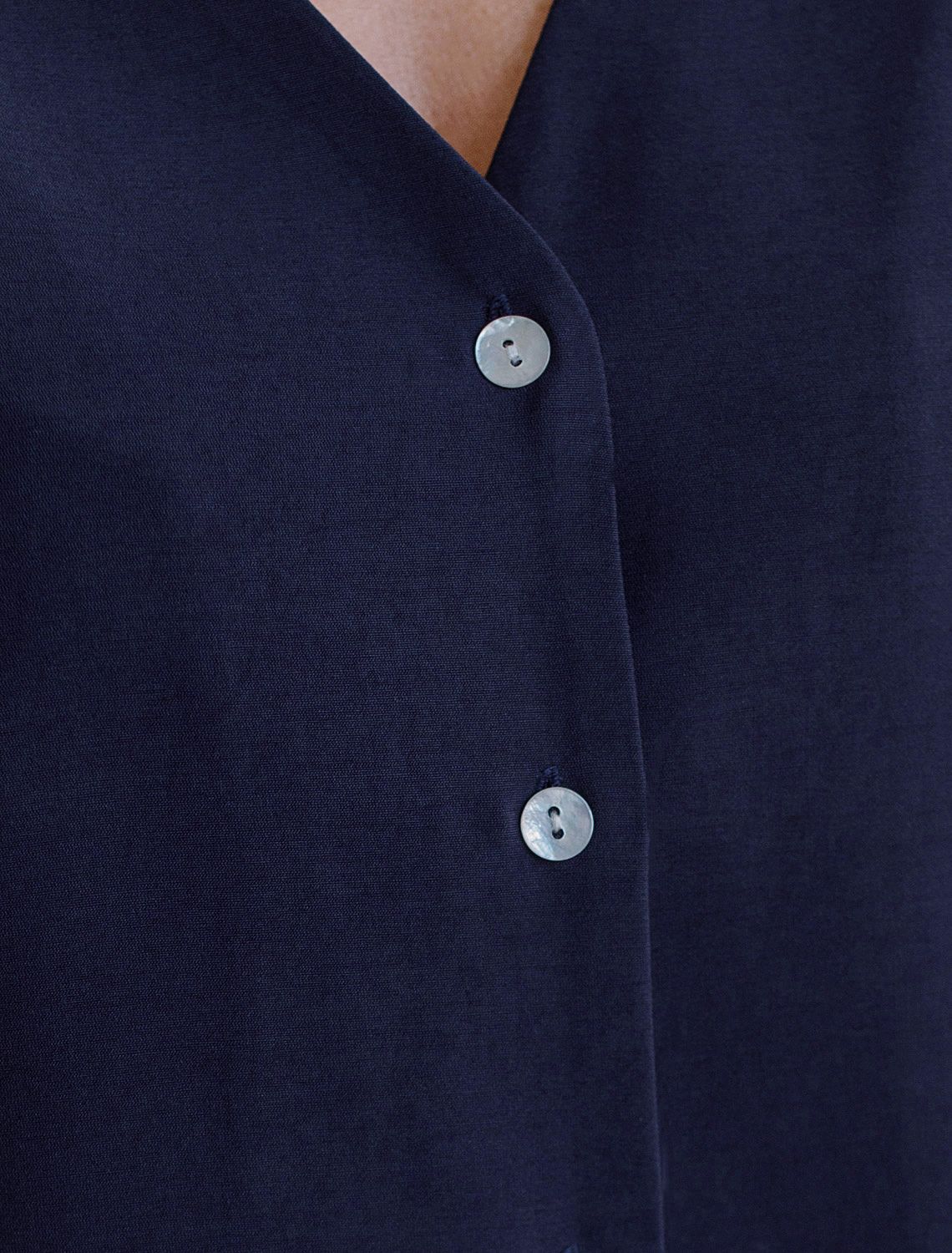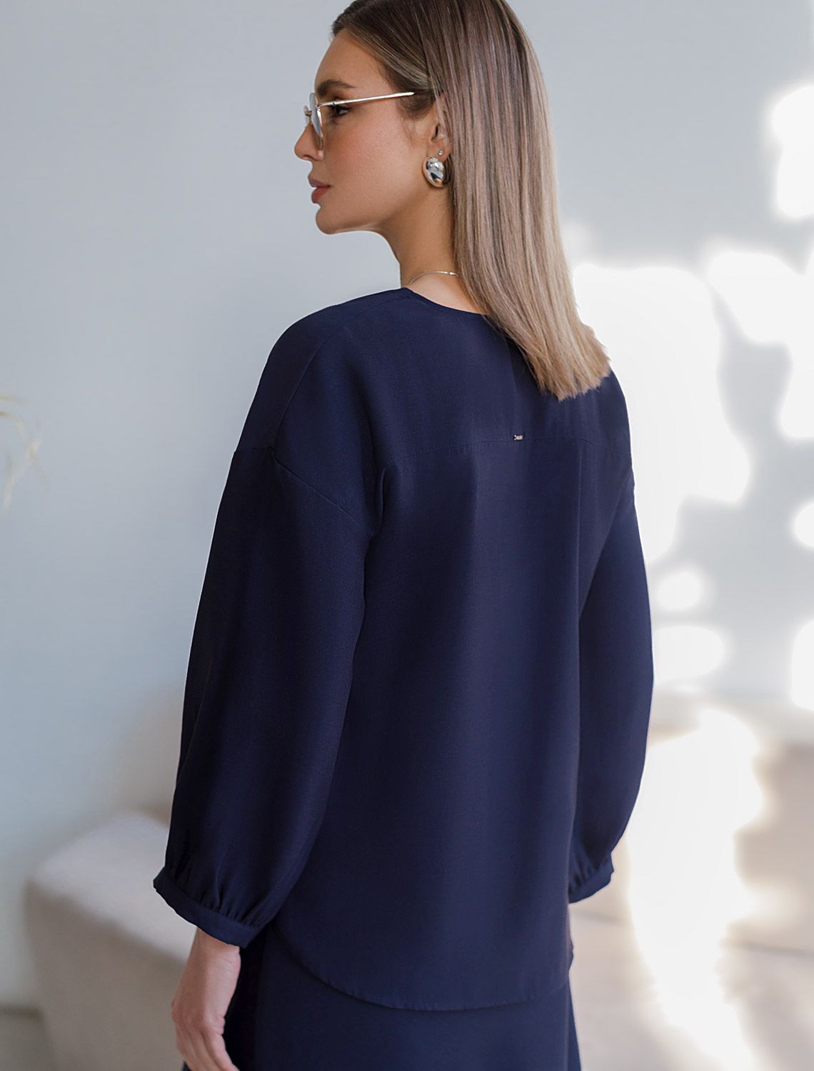 Элегантная укороченная блузка темно-синего цвета выполнена из плотного лиоцелла. Лиоцелл это более дорогой и экологичный вариант вискозы, очень прочный и шелковистый. Ткань отличается от регулярной коллекции из лиоцелла - она содержит еще больше лиоцелла (92%), благодаря чему имеет более нежную шелковистую фактуру. Модель дополнена объемными рукавами длиной 7/8, создающими модный акцент. Укороченная передняя часть блузки выгодно подчеркивает линию талии, а удлиненная спинка обеспечивает комфорт. Этот асимметричный фасон придает образу динамичности, а V вырез визуально вытягивает силуэт. Свободный крой романтиной блузки не сковывает движений и отлично садится по фигуре даже на большие размеры, скрывая возможные недостатки. Эта легкая блузка с застежкой на пуговицы идеальный выборо для комфорта и стиля в теплое время года, она идеально адаптируется под любой повод.