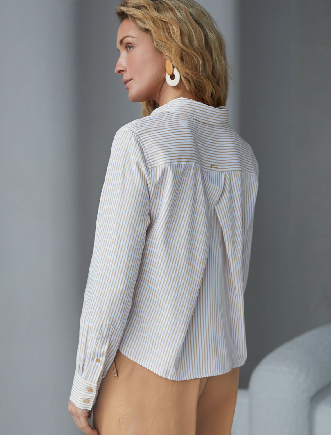 Стильная укороченная блузка белого цвета в бежевую полоску создана для комфорта в любой ситуации. Хлопок делает модель приятной для тела и хорошо дышащей, что особенно важно в течение долгого дня. Свободный крой не ограничивает движения, подходит на любую фигуру и гармонично смотрится в разных образах. Всегда актуальный принт в полоску визуально вытягивает и стройнит фигуру, добавляет образу динамики, делая блузку эффектным акцентом в гардеробе. Повседневная блузка держит форму даже после продолжительной носки, что помогает всегда выглядеть аккуратно. На спинке выполнена декоративная складка, придающая дополнительный объем и интересный силуэт. Отложной воротник придает классический вид,, подходящий для офисных будней. Особенно стильно рубашка смотрится в непринужденных, городских или повседневных комплектах.