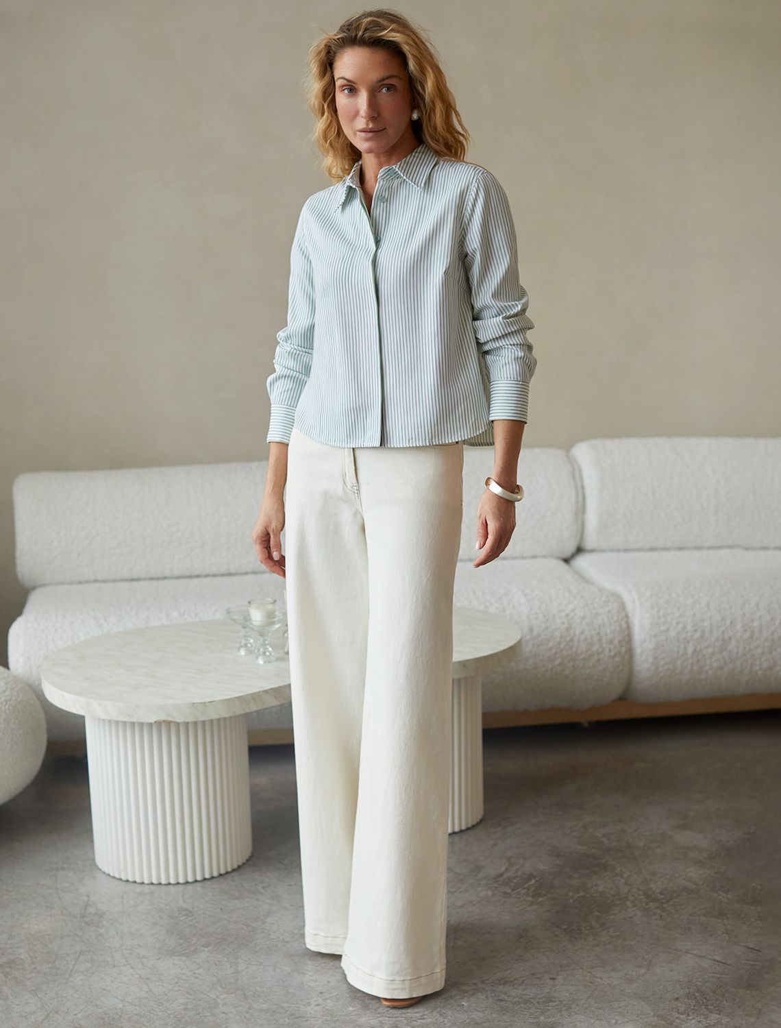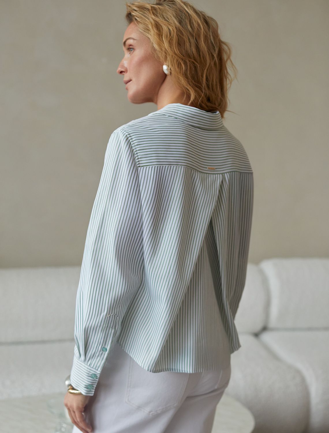 Стильная укороченная блузка белого цвета в фисташковую полоску создана для комфорта в любой ситуации. Хлопок делает модель приятной для тела и хорошо дышащей, что особенно важно в течение долгого дня. Свободный крой не ограничивает движения, подходит на любую фигуру и гармонично смотрится в разных образах. Всегда актуальный принт в полоску визуально вытягивает и стройнит фигуру, добавляет образу динамики, делая блузку эффектным акцентом в гардеробе. Повседневная блузка держит форму даже после продолжительной носки, что помогает всегда выглядеть аккуратно. На спинке блузки расположена встречная бантовая складка с наклоном, что создаёт красивый визуальный эффект и придаёт дополнительный объем. Рукава обработаны широким манжетом на 2 пуговицы. Дополнительная пуговица на планке рукава не даёт раскрываться и топорщиться разрезу. Отложной воротник придает классический вид,, подходящий для офисных будней. Особенно стильно рубашка смотрится в непринужденных, городских или повседневных комплектах.
