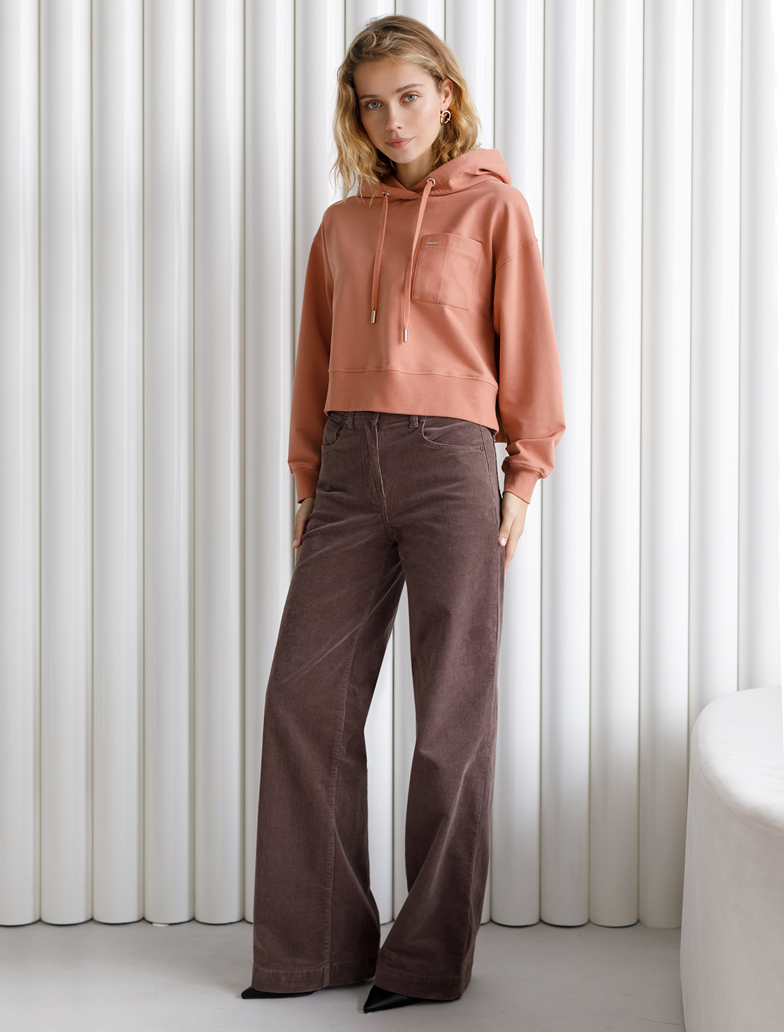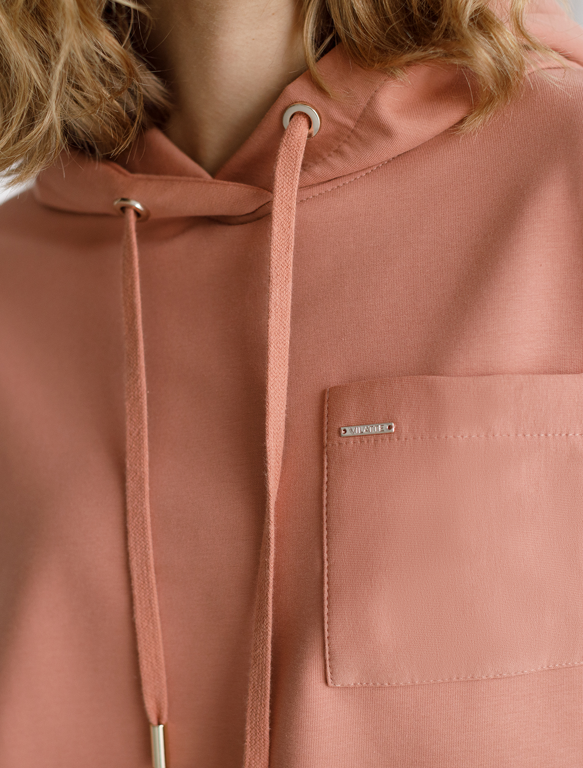 Худи классное! Ткань плотная, шелковистая, приятная к телу, цвет терракотовый, очень красивый. На ОГ 102 размер 50 сел очень свободно, но в тоже время комфортно, нет ощущения, что велико. Длина до талии мне тоже очень понравилась, прекрасно сочетается с джинсовым и льняным низом