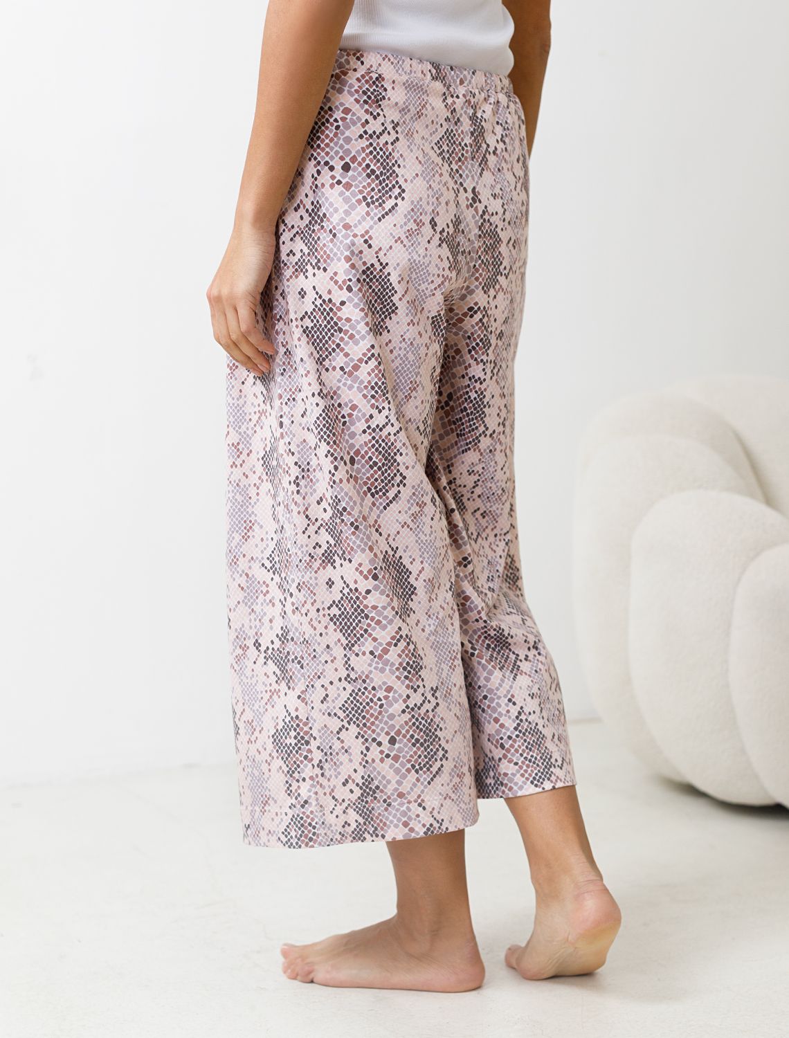 Комфортные укороченные широкие брюки кофейно-пудрового цвета на тонкой резинке выполнены из 100% хлопка плотностью 140 Г/м2. Главная особенность этого изделия — тонкое кулирное полотно, которое легче и воздушнее стандартного трикотажа. Благодаря своей деликатной текстуре модель идеально подходит для домашних образов и пижамных комплектов. Ткань отлично «дышит», обеспечивая максимальный уют во время сна и отдыха. Эти свободные брюки обеспечивают максимальную свободу движений благодаря широкому крою. Эластичная резинка в области талии гарантирует удобную посадку и индивидуальное прилегание по фигуре. Защипы добавляют выразительность образу и помогают сформировать актуальный силуэт, подчеркивая современные тенденции. Повседневные брюки с трендовым змеиным принтом подходят для больших размеров, мягко скроют возможные недостатки фигуры, подчеркивая комфорт и стиль. Домашние брюки кюлоты отлично сочетаются с разными вариантами верхней одежды, поэтому их можно носить не только дома, но и на прогулках. Удобные брюки созданы для тех, кто ценит комфорт и практичность без лишних деталей.