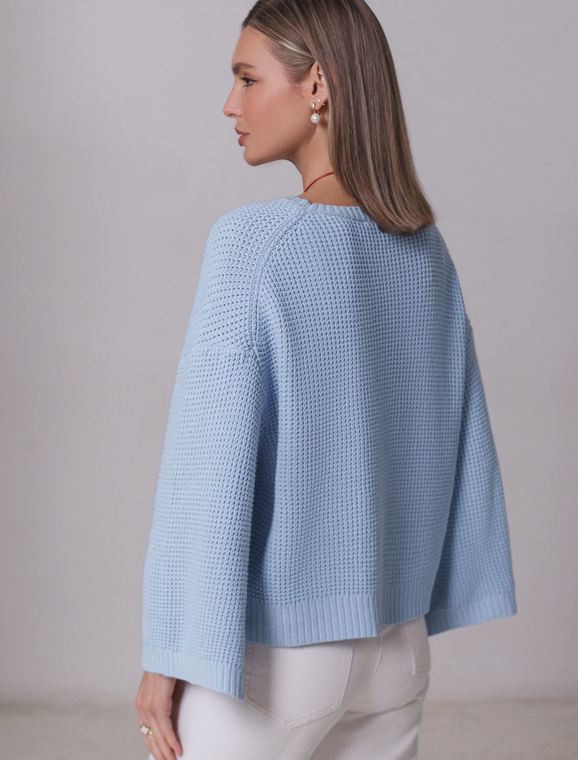 Стильный укороченный джемпер светло-голубого цвета создан для тех, кто ценит современный образ и комфорт. Свободный крой подчеркивает легкость и позволяет чувствовать себя уютно в любой ситуации. Рельефная вязка в виде оригинального узора "шашечки" добавляет джемперу выразительности. Благодаря натуральному хлопку повседневный джемпер обеспечивает комфорт даже в жаркие дни: хлопок позволяет коже дышать и поддерживает оптимальный микроклимат. А акрил в составе придает мягкость, отличную цветостойкость, а также гипоаллергенность и устойчивость к деформации, что делает джемпер легким в уходе. Круглый ворот и спущенная линия плеча добавляют образу аккуратности и расслабленности. Широкие рукава создают воздушность и делают силуэт особенно женственным. Такой джемпер легко сочетать с широкими и узкими низами для создания повседневного или более нарядного ансамбля. Джемпер отлично подойдет для прохладных весенних и летних дней благодаря плотности материала, а также станет удачным решением для многослойных луков. Вязка подчеркивает индивидуальность вещи и привлекает внимание к деталям вашего стиля.