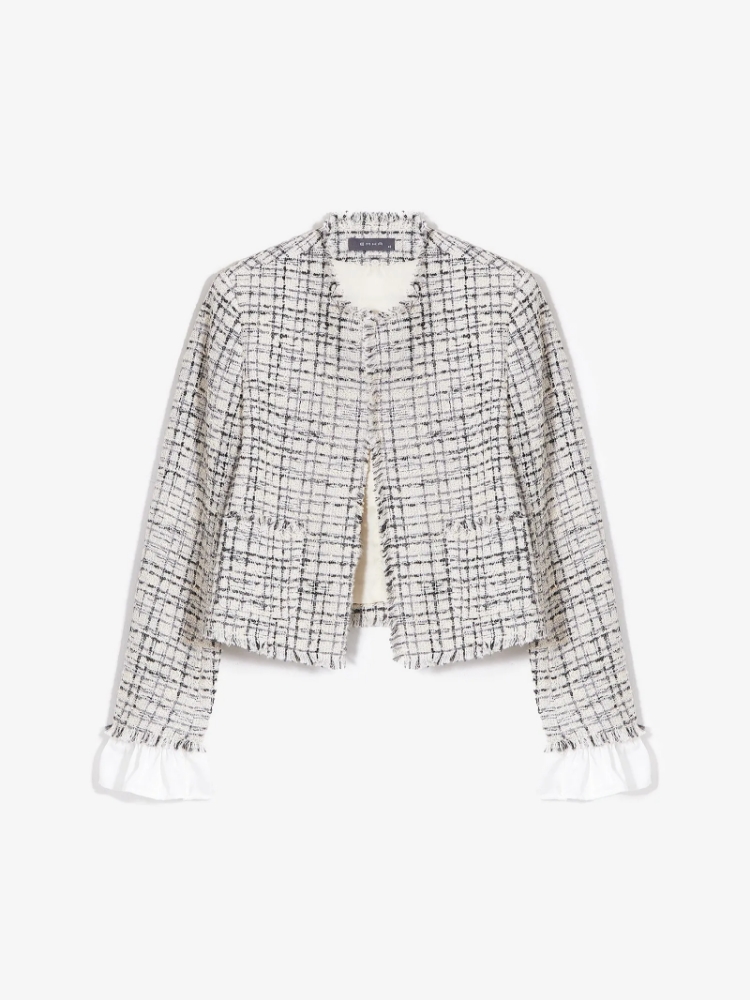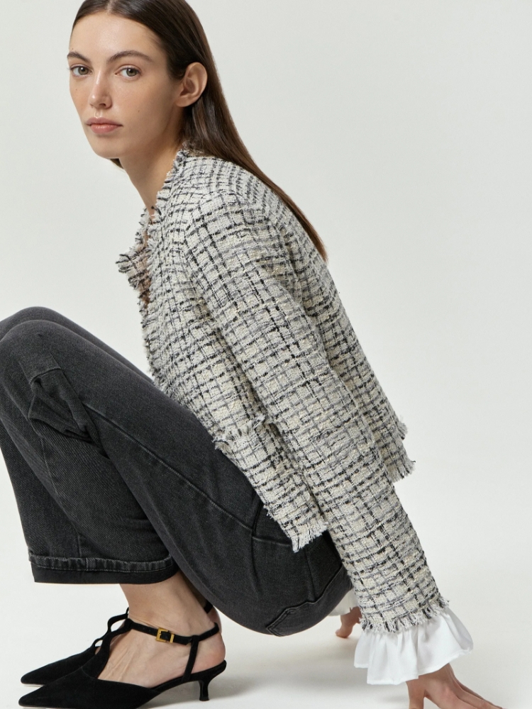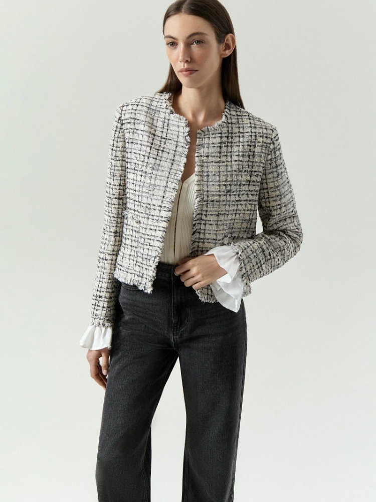 Твидовый жакет без пуговиц. Изюминка модели — отстёгивающиеся оборки на рукавах. Необработанный край также добавляет оригинальности и живости. Фактурный материал с содержанием вискозы и хлопка сочетает в себе несколько базовых оттенков. За счёт этого увеличивается потенциал сочетаемости вещи. Укороченная модель прямого кроя имеет накладные карманы по бокам. Изделие выполнено на подкладке, не имеет застёжек. Дополнить образ можно любым денимом