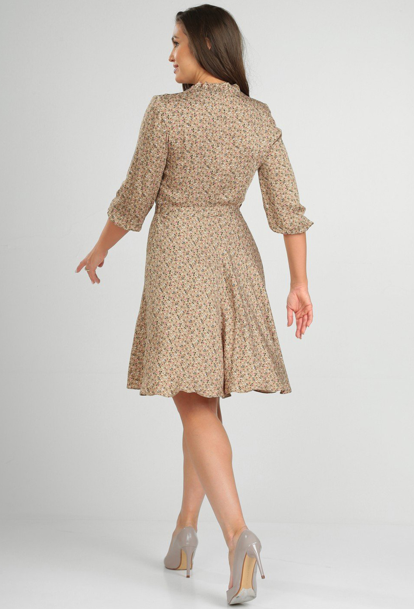 Платье без подкладки с плечевыми накладками, пол линии талии отрезное, в боковом шве молния, по горловине рюша и завязки.