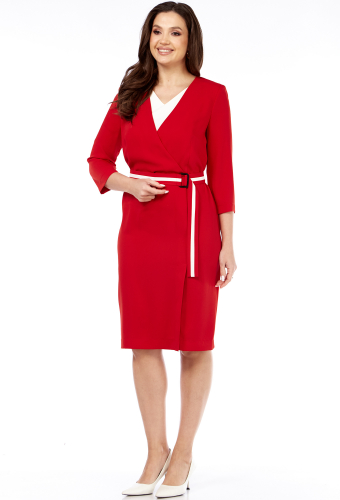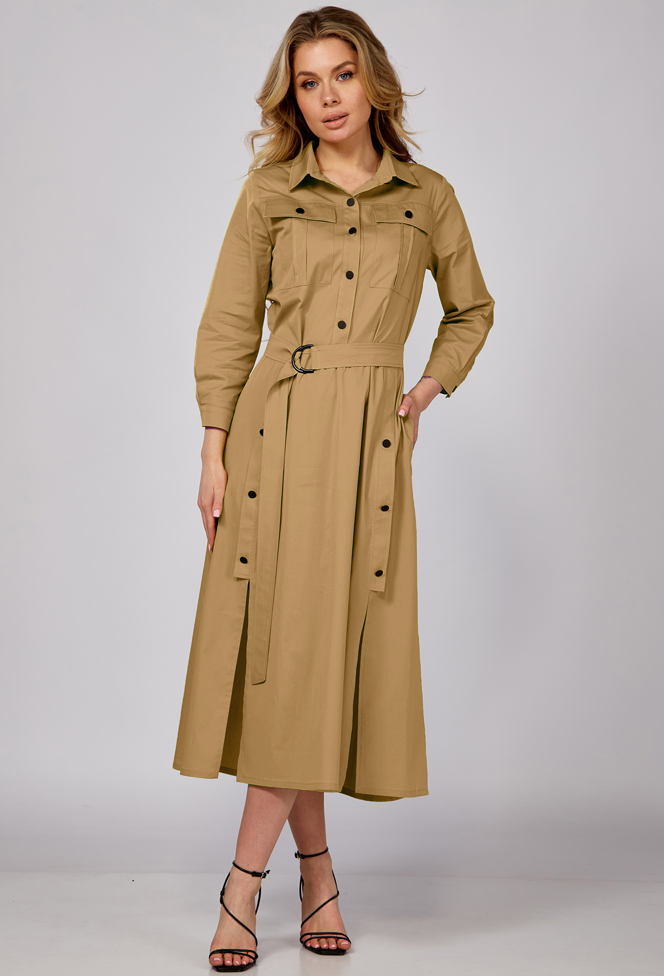 Платье полуприлегающего силуэта выполнено из ткани с хлопком, без подкладки. Платье отрезное по талии с поясом. По переду накладные карманы с клапанами. Лиф выполнен в рубашечном стиле на застежку. Рукав 3/4 на манжете. Юбка расширенная к низу с декоративными планками по переду. Карманы в боковых швах.