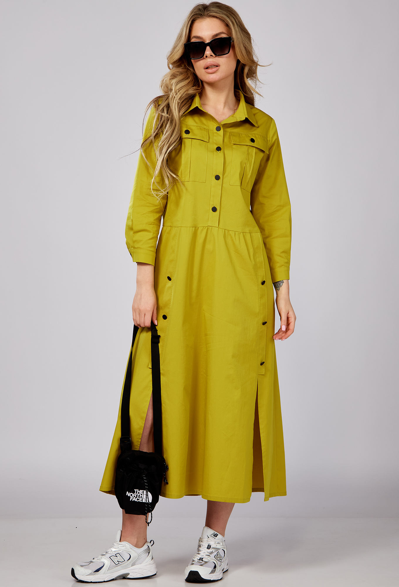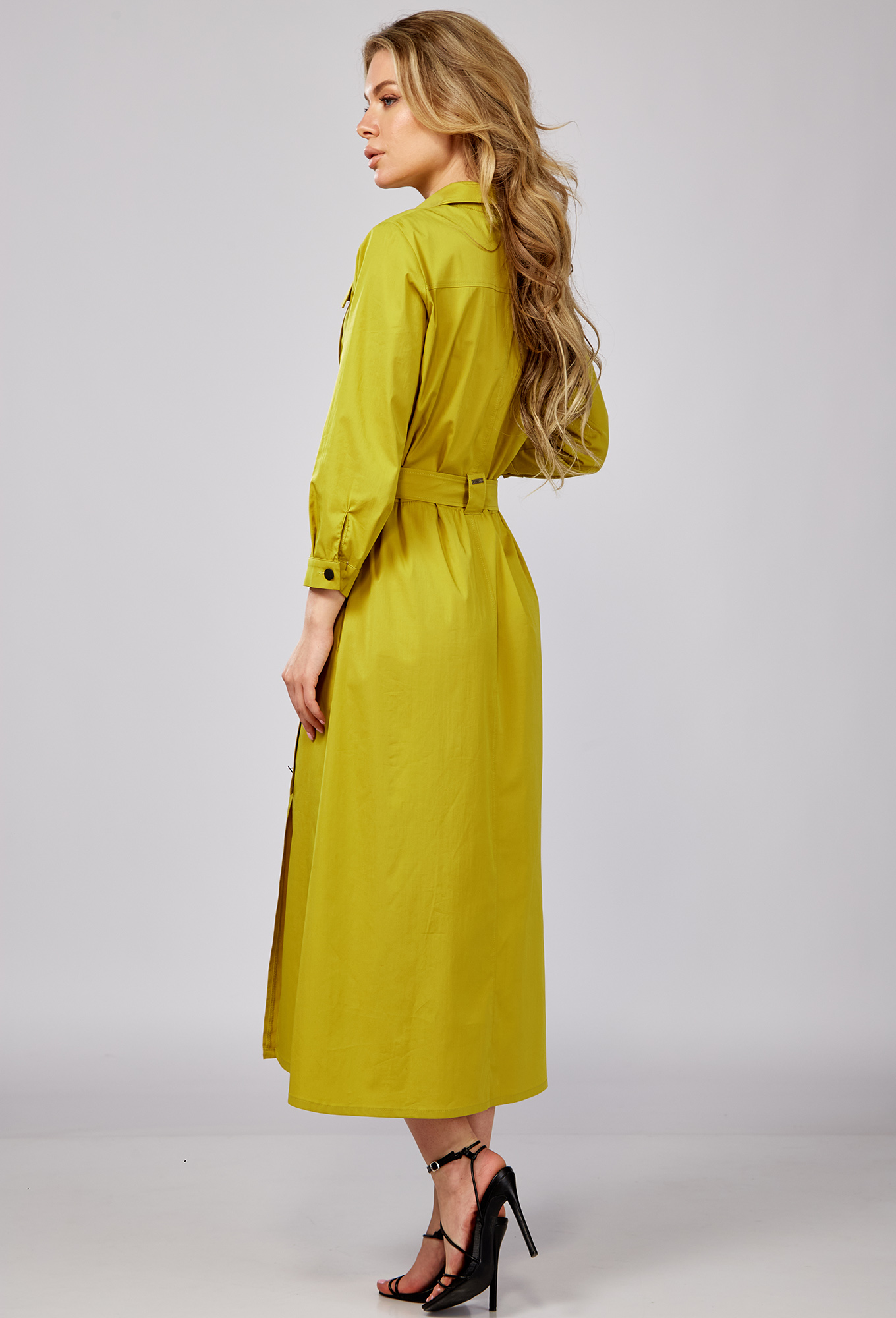 Платье полуприлегающего силуэта выполнено из ткани с хлопком, без подкладки. Платье отрезное по талии с поясом. По переду накладные карманы с клапанами. Лиф выполнен в рубашечном стиле на застежку. Рукав 3/4 на манжете. Юбка расширенная к низу с декоративными планками по переду. Карманы в боковых швах.