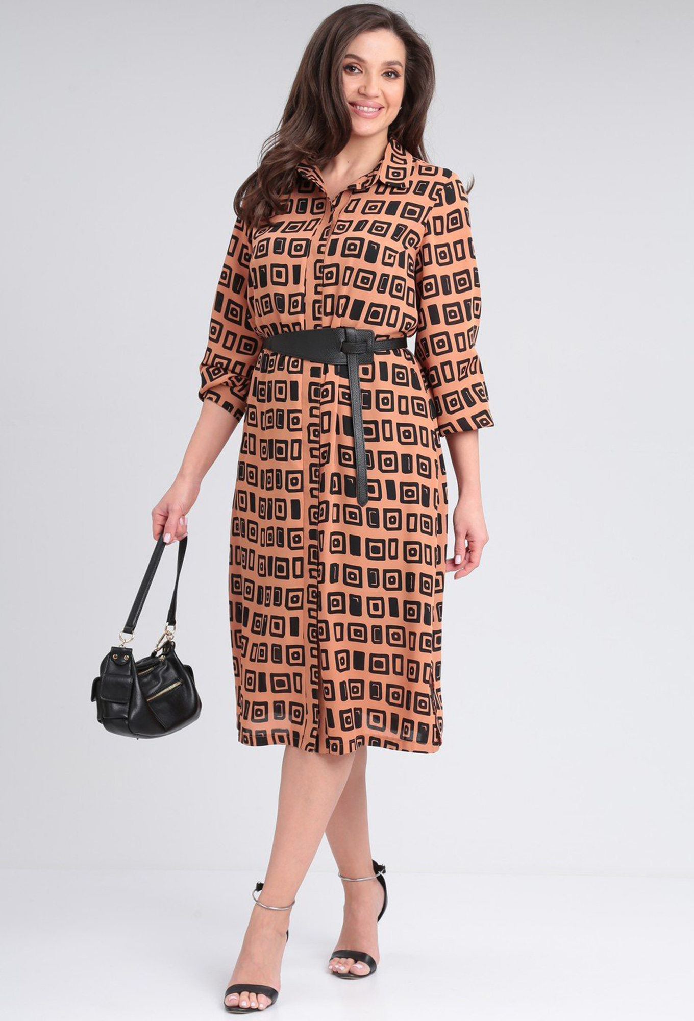 Платье А-образного силуэта под пояс. Воротник рубашечного типа, планка с потайной застёжкой на петли пуговицы. В боковых швах карманы и разрезы по низу изделия. Длинный рукав на манжете. В комплекте ремень из экокожи.