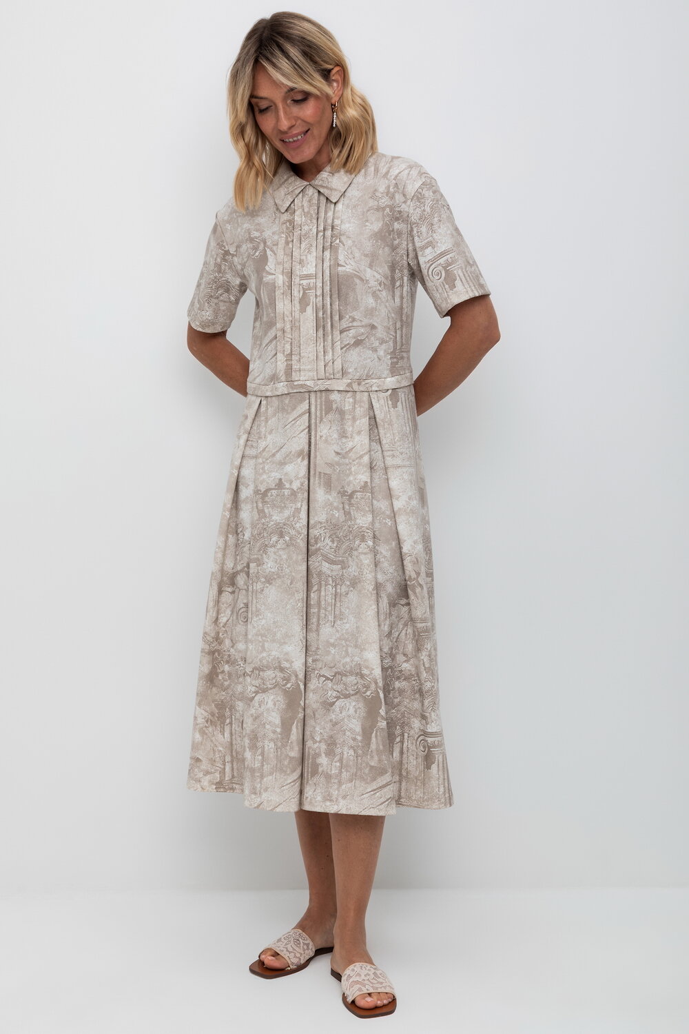 Платье с воротником из плотного набивного трикотажа интерлок. Модель с короткими рукавами, юбкой в складку и декоративными застроченными складками по груди.
