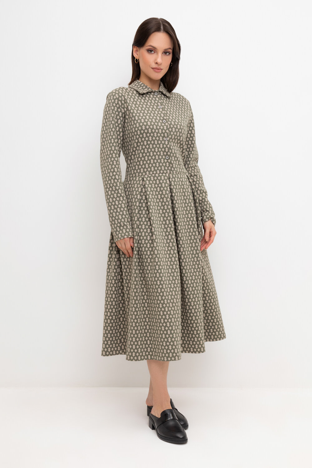 Платье с воротником из плотного набивного трикотажа интерлок. Модель с длинными рукавами и юбкой в складку. Все трикотажные полотна производятся в соответствии с нормами Швейцарского сертификата ЭкоТекс. Сделано в России