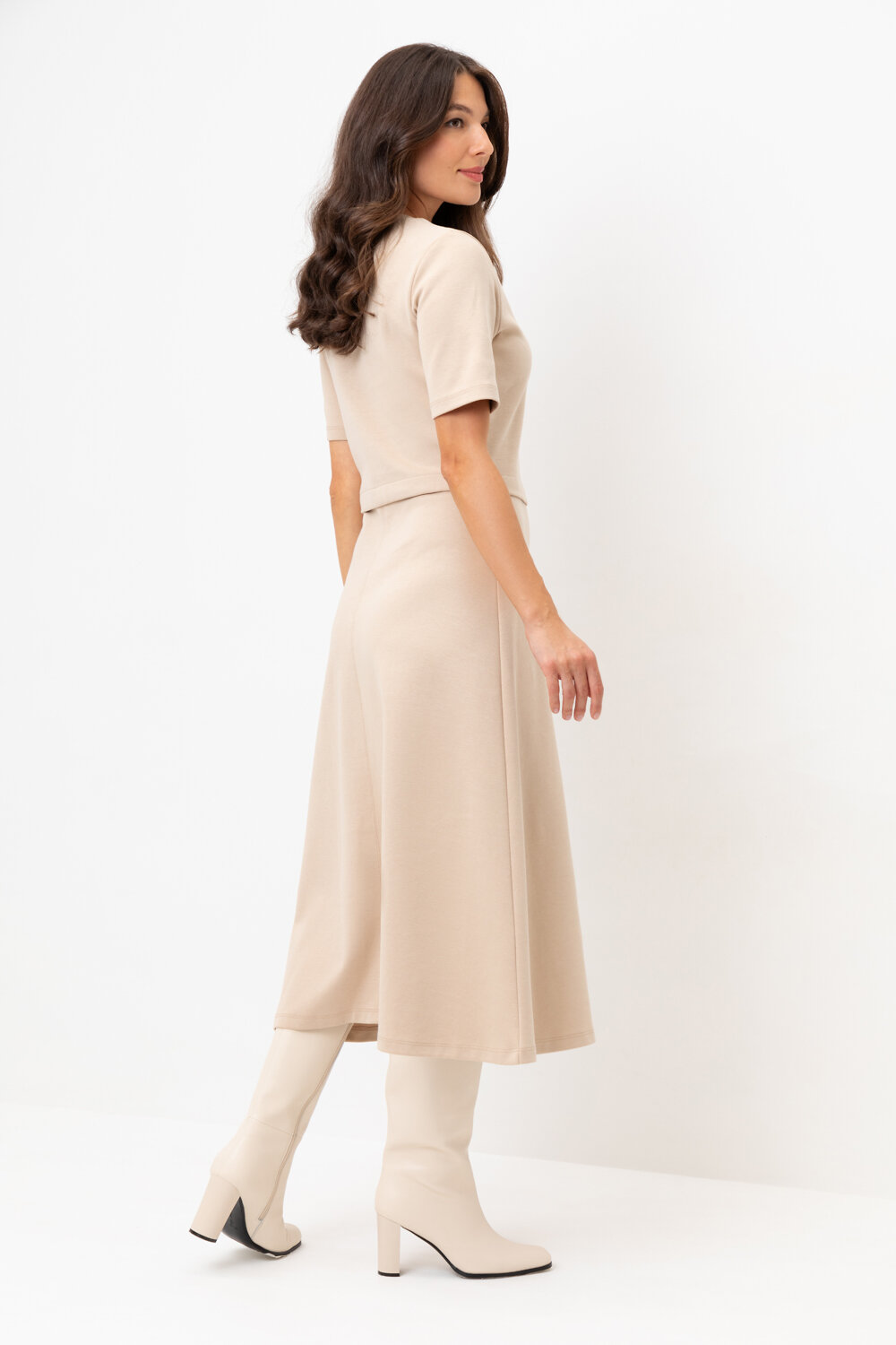 Платье с круглым вырезом и короткими рукавами из плотного трикотажа интерлок. Модель с трапециевидной юбкой.