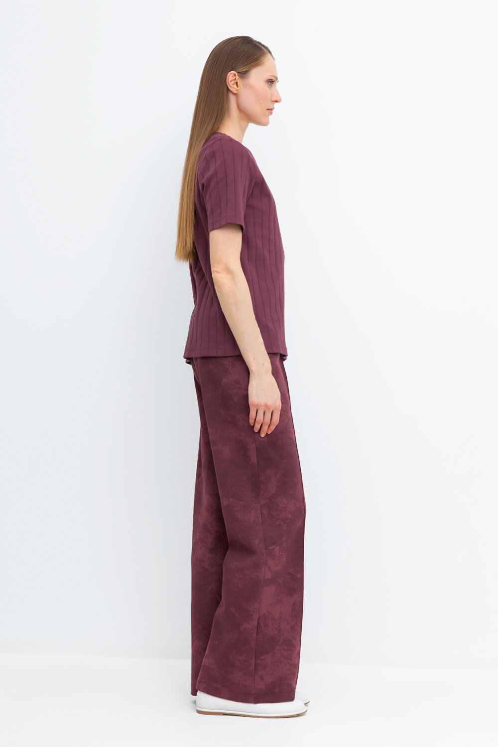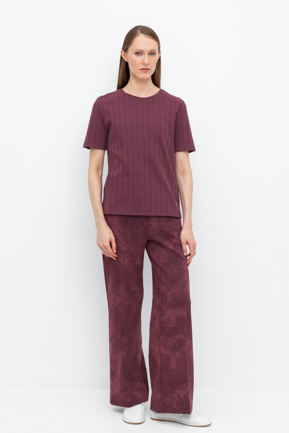 Брюки прямого кроя со стрелкой и боковыми карманами из плотного гладкого трикотажа интерлок. Застёгивается спереди на молнию и кнопку. В составе 80% натурального хлопка и 20% полиэстера, при этом полиэстер ввязан внутрь по особой технологии и не соприкасается с кожей.