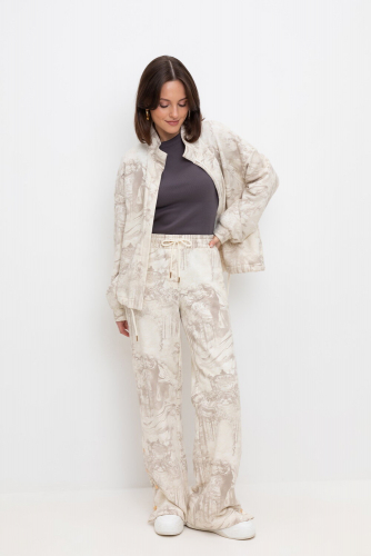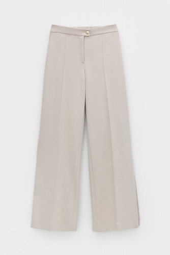 Свободные женские брюки с разрезами и боковыми карманами из плотного гладкого трикотажа интерлок. Низ обработан плоскими швами.