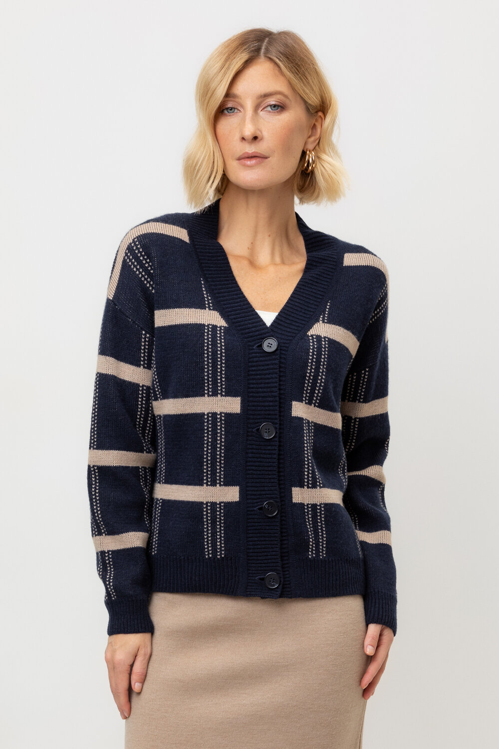 Вязаный кардиган на пуговицах из шерсти с добавлением акрила. Связан жаккардом, а манжеты и нижний край не растянутся благодаря вывязанной резинке.