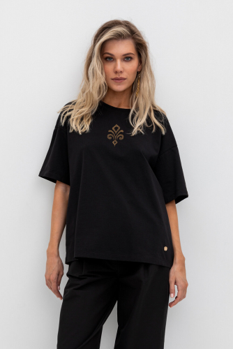 Удлиненная футболка из лёгкого набивного трикотажа супрем. Свободные рукава со спущенной линией плеча создают объём и свободный силуэт.