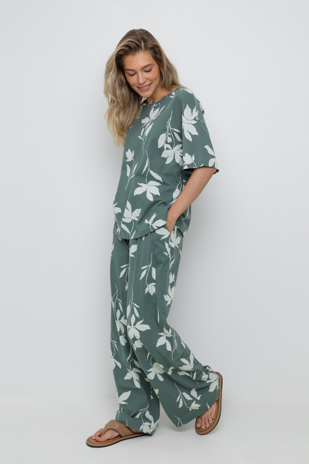 Брюки прямого свободного кроя с боковыми карманами из набивного трикотажа супрем.