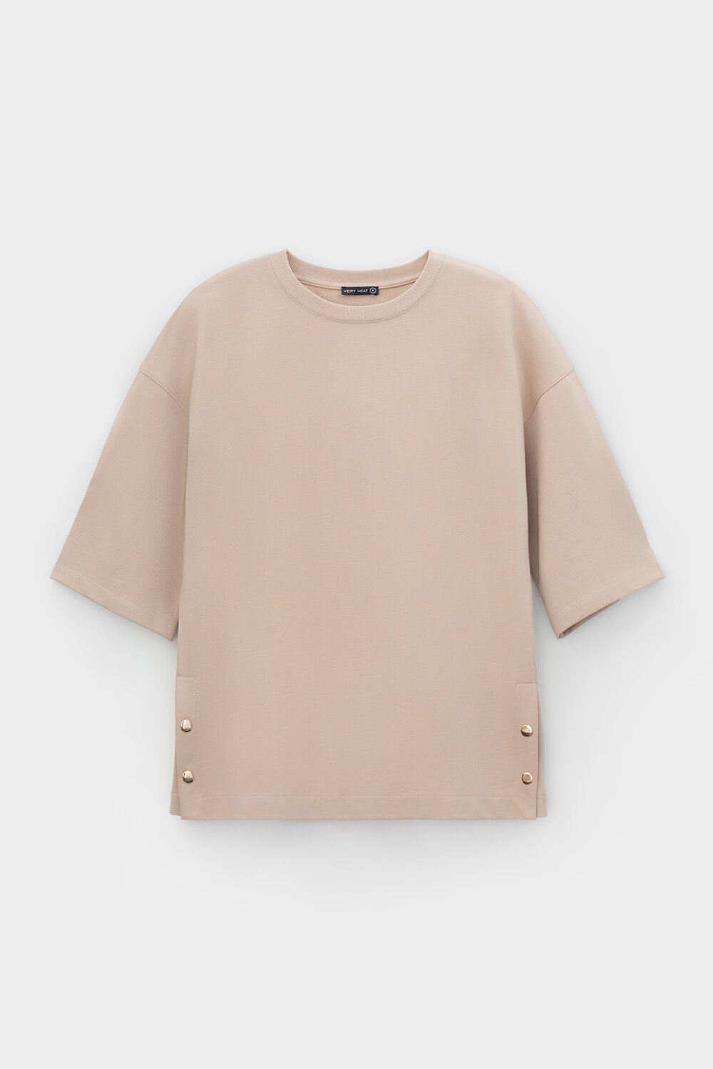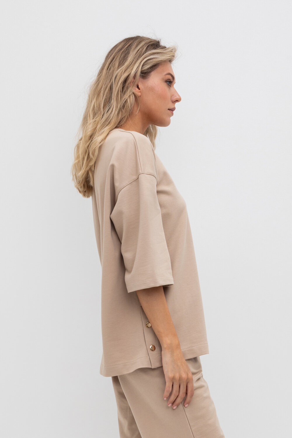 Удлиненная футболка из футера с боковыми разрезами, застегивающимися на металлические кнопки. Свободные рукава со спущенной линией плеча создают объём и свободный силуэт.