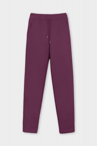 Теплые брюки зауженного кроя с боковыми карманами из мягкого набивного трикотажного футера трёхнитки. Пояс со шнурком позволяет регулировать посадку.