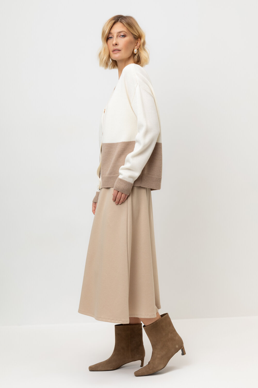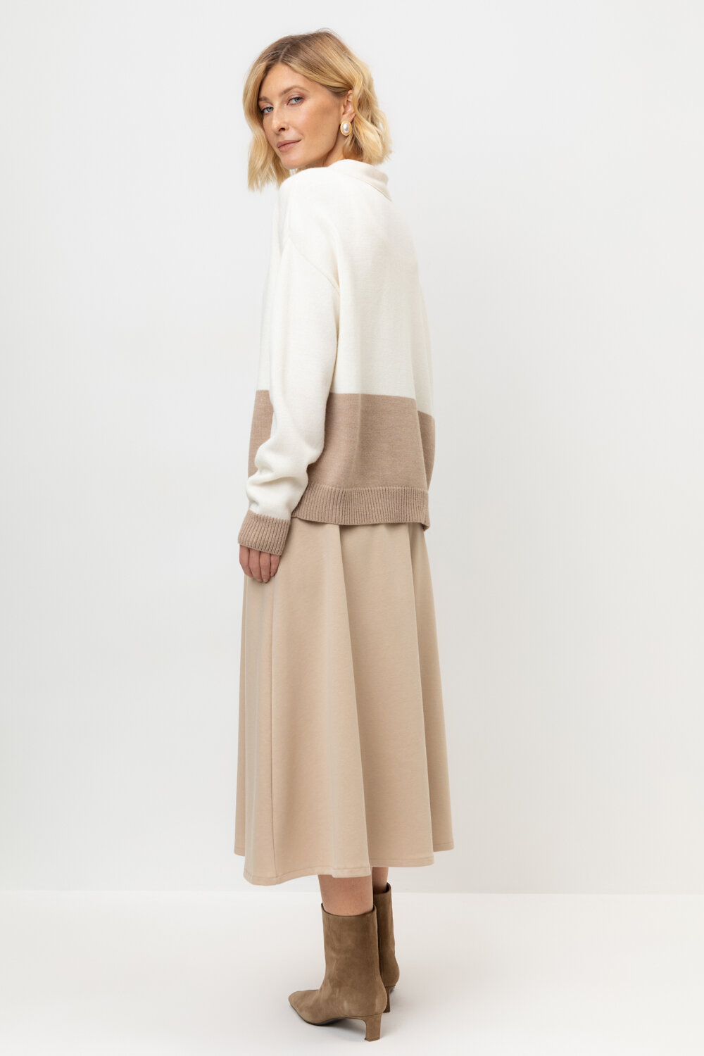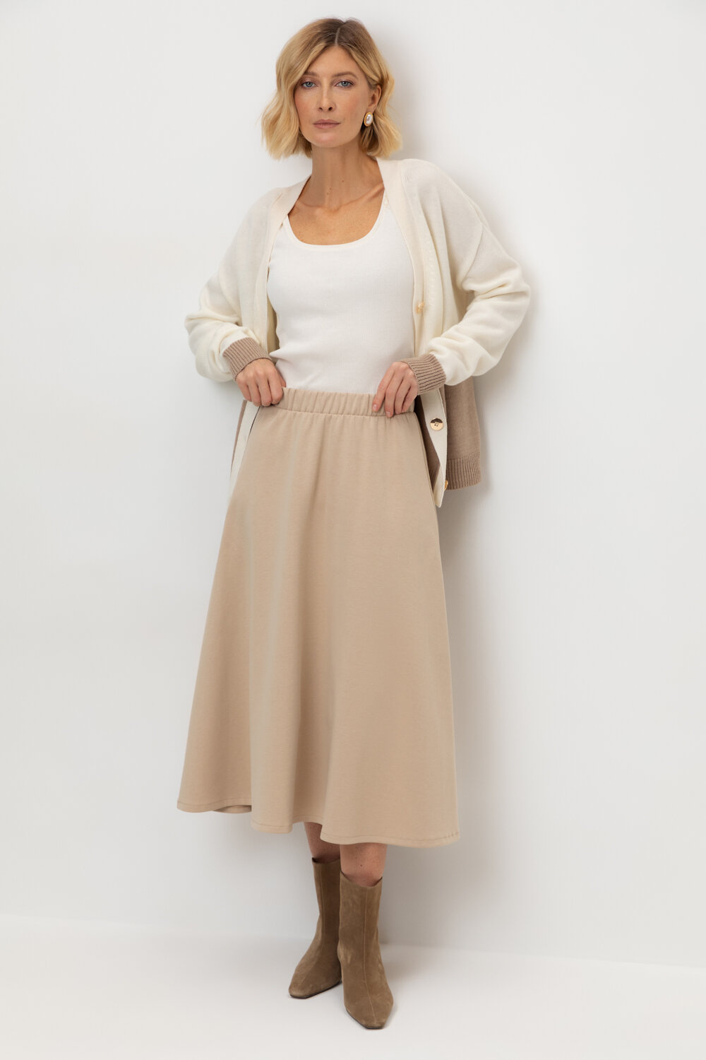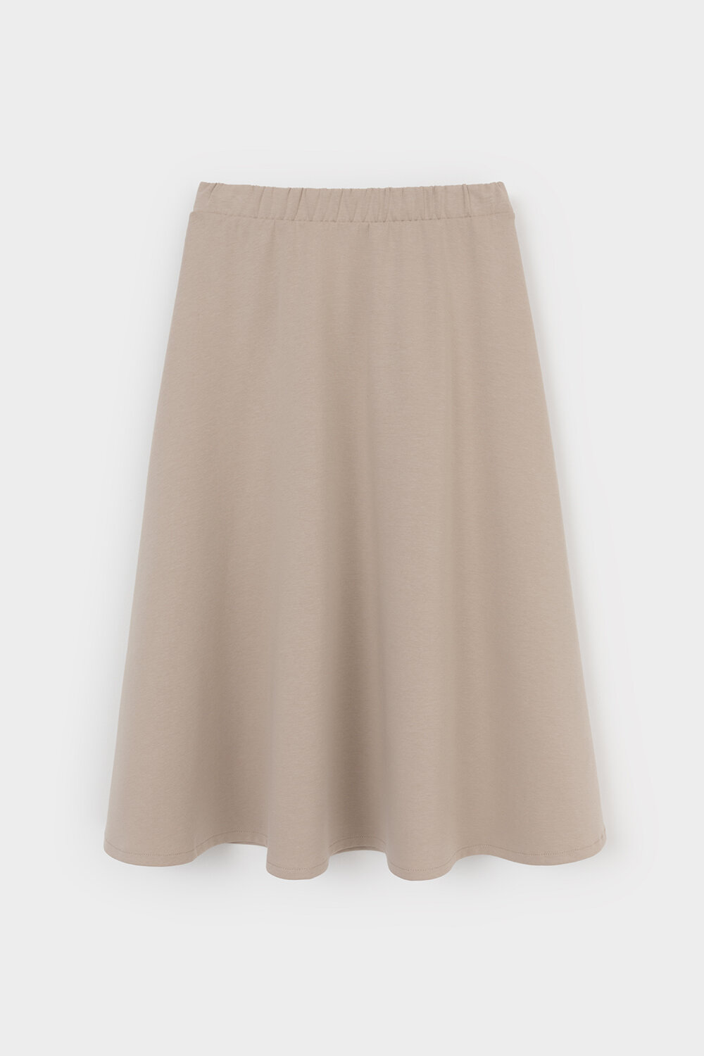 Трикотажная юбка длины миди из плотного гладкого трикотажа интерлок, произведенного из высококачественного гребенного хлопка. В составе 80% натурального хлопка и 20% полиэстера, при этом полиэстер ввязан внутрь по особой технологии и не соприкасается с кожей. Застегивается на потайную молнию. Изделие сохраняет цвет и форму после многократных стирок.