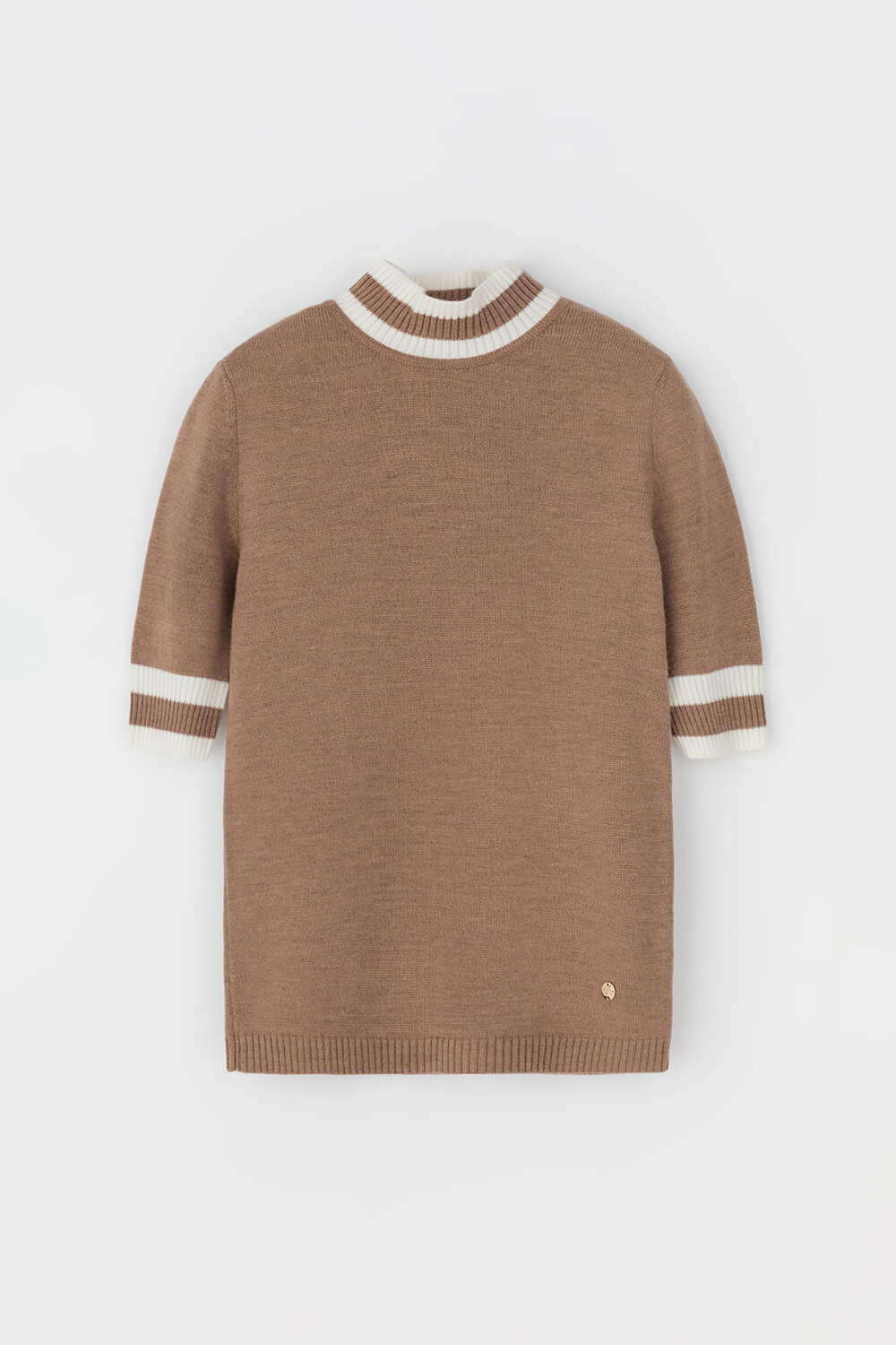 Джемпер в стиле прямой футболки, воротником-стойкой и короткими рукавами. Прямой силуэт, стандартная длина. Средняя плотность вязания, пластичная фактура. Выполнен гладью из мягкой полушерстяной пряжи. Шерсть в составе сохраняет тепло, а благодаря волокнам акрила изделие мягкое и дольше сохраняет форму.