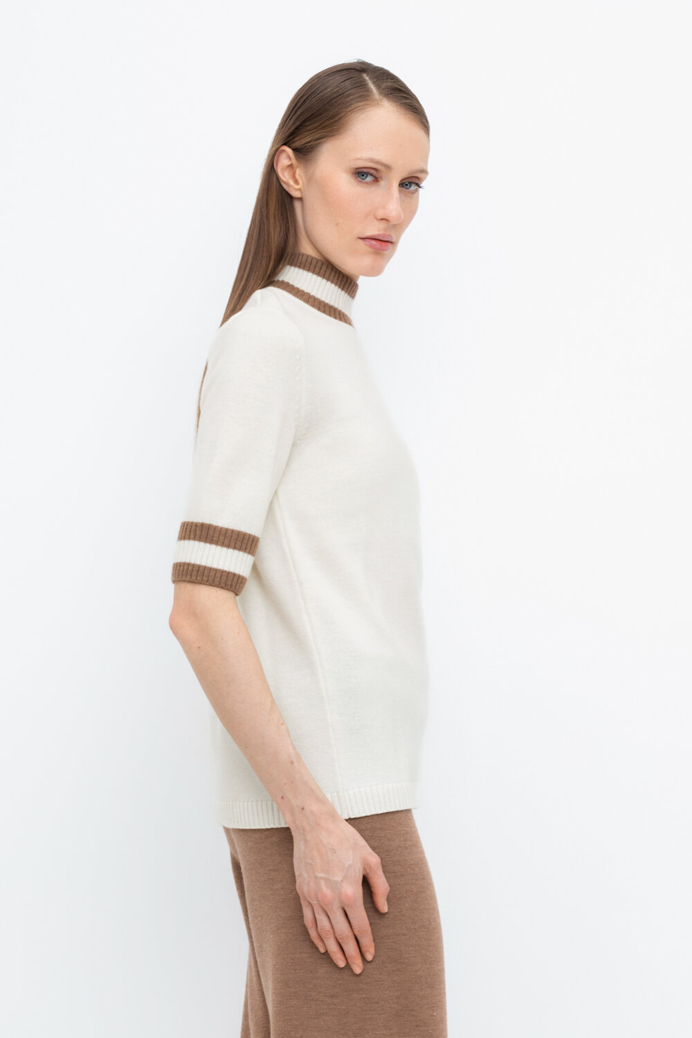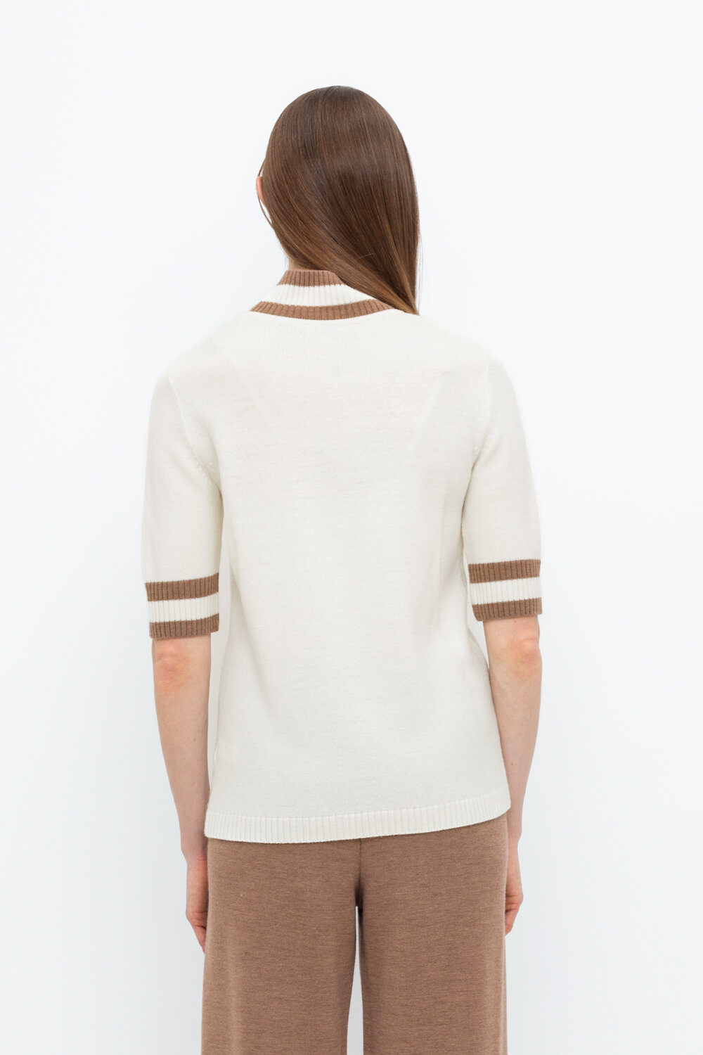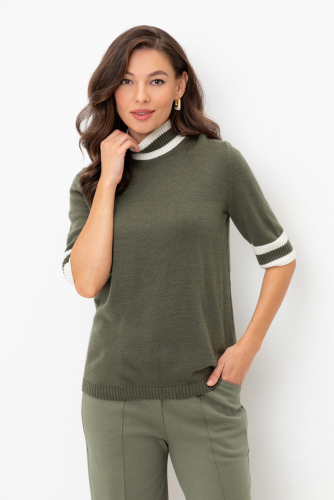 Джемпер в стиле прямой футболки, воротником-стойкой и короткими рукавами. Прямой силуэт, стандартная длина. Средняя плотность вязания, пластичная фактура. Выполнен гладью из мягкой полушерстяной пряжи. Шерсть в составе сохраняет тепло, а благодаря волокнам акрила изделие мягкое и дольше сохраняет форму.