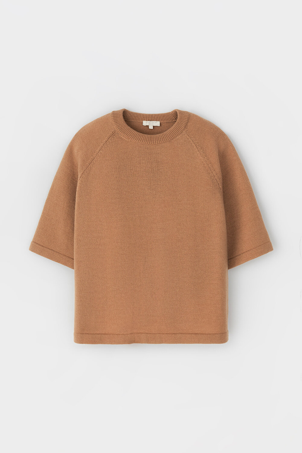 Джемпер в стиле прямой футболки стандартной длины с короткими рукавами-реглан. Выполнен гладью. Средняя плотность вязания и пластичная фактура сохраняют форму изделия.