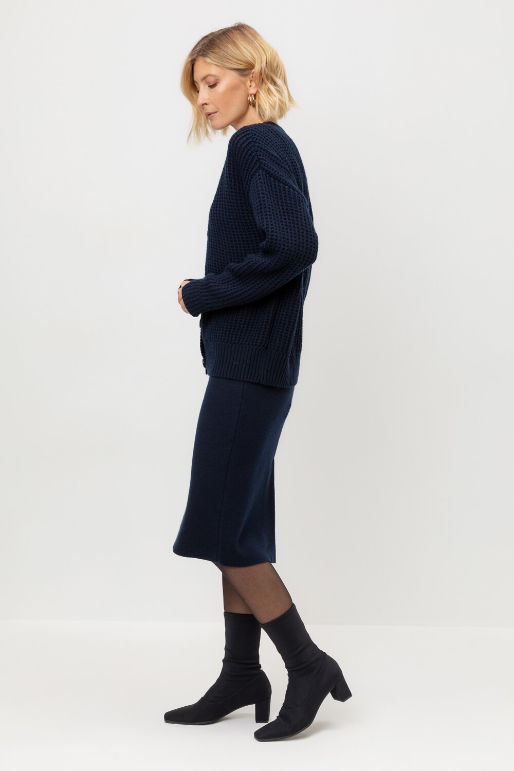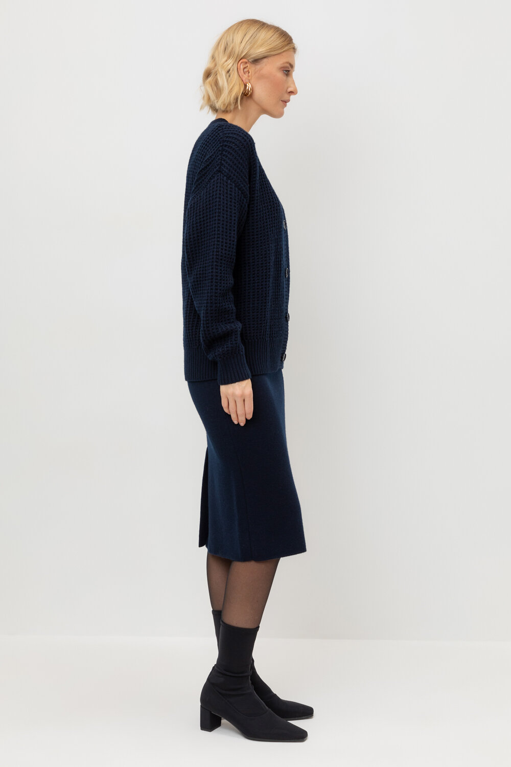 Юбка вязаная длины миди из полушерстяной пряжи. Состав 50% шерсть и 50% акрил. Шерсть в составе сохраняет тепло, а акрил делает изделие мягким и обьемным.