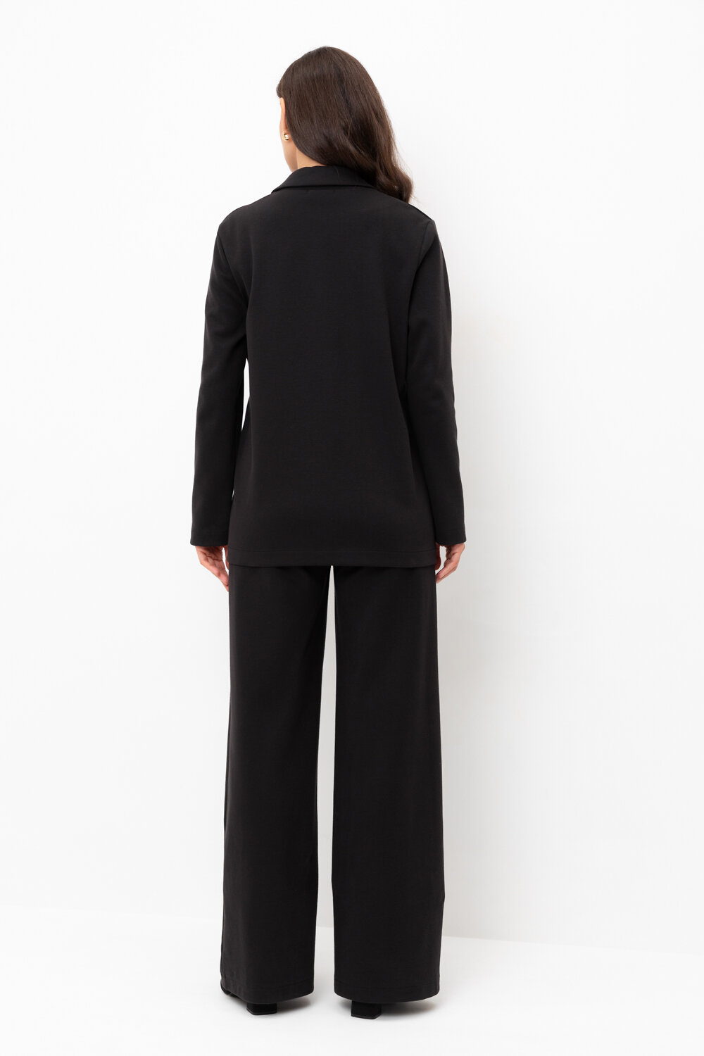 Свободные женские брюки со стрелкой и боковыми карманами из плотного гладкого трикотажа интерлок. Застежка на кнопку. Низ обработан плоскими швами.