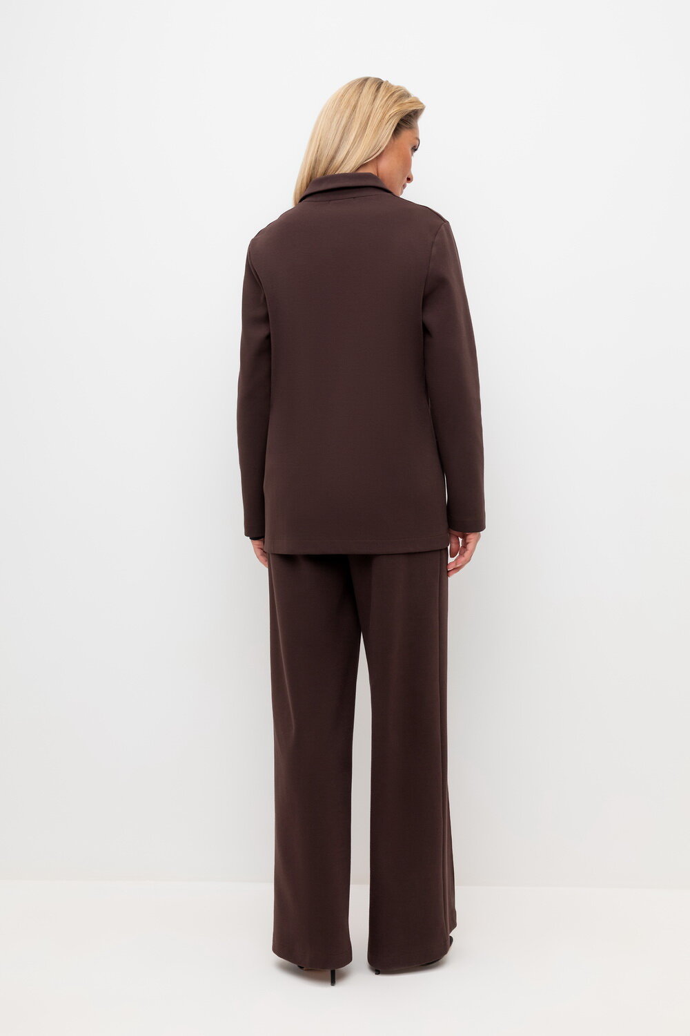 Свободные женские брюки со стрелкой и боковыми карманами из плотного гладкого трикотажа интерлок. Застежка на кнопку. Низ обработан плоскими швами.