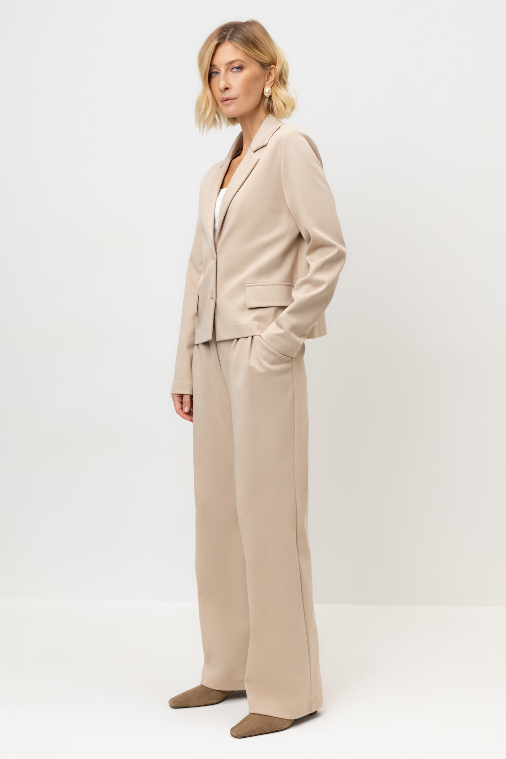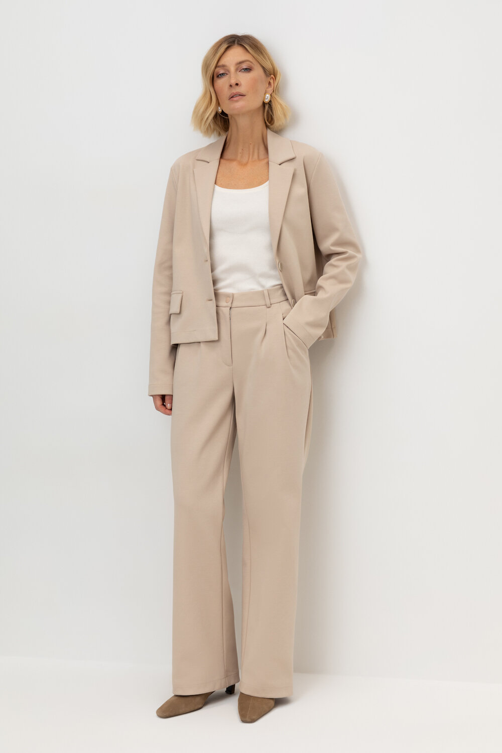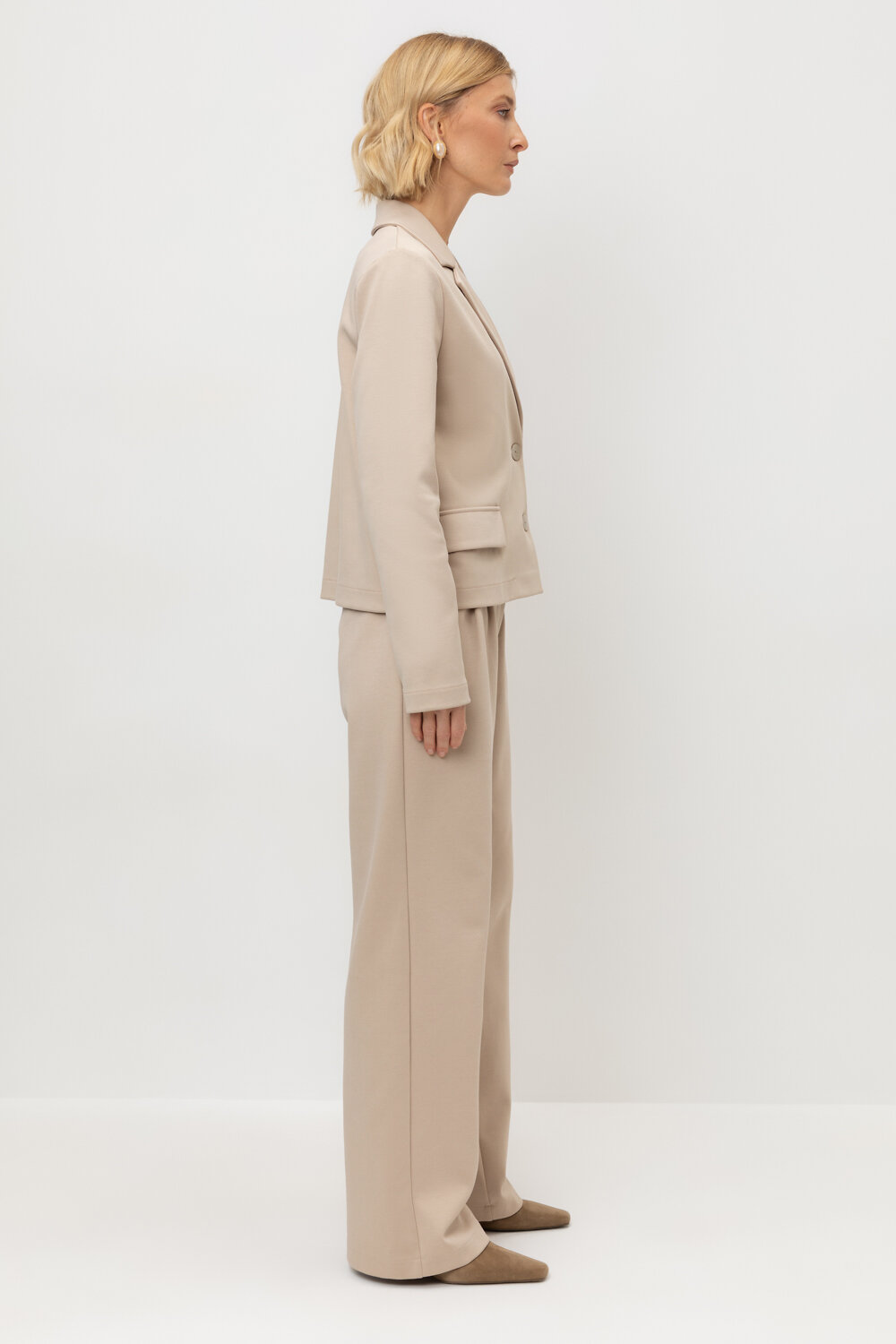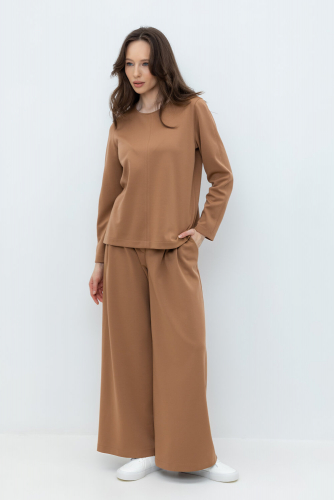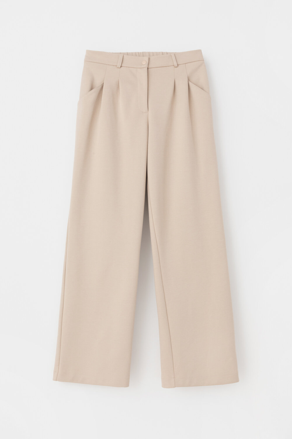 Брюки свободного кроя с декоративными складками и боковыми карманами из плотного гладкого трикотажа интерлок. Застёгивается спереди на молнию и кнопку. Пояс по спинке на резинке. В составе 85% натурального хлопка и 15% полиэстера, при этом полиэстер ввязан внутрь по особой технологии и не соприкасается с кожей.