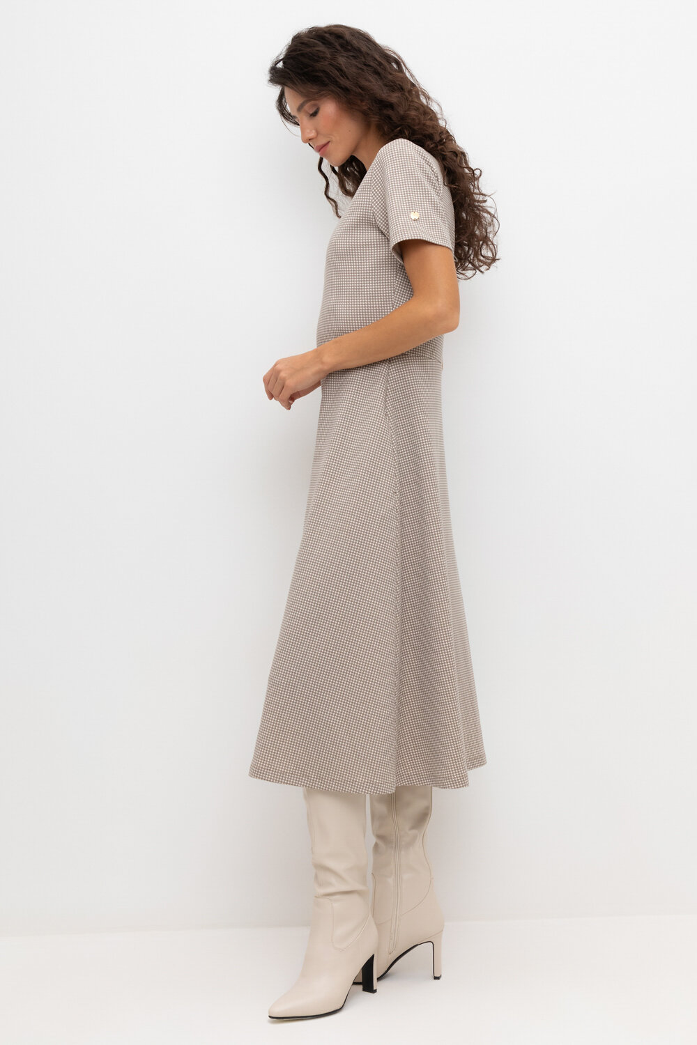 Платье с круглым вырезом и короткими рукавами из плотного набивного трикотажа интерлок. Модель с трапециевидной юбкой и боковыми карманами.