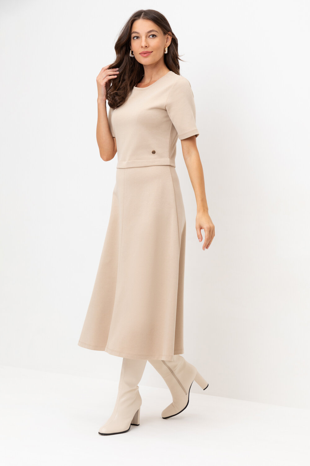 Платье с круглым вырезом и короткими рукавами из плотного трикотажа интерлок. Модель с трапециевидной юбкой.