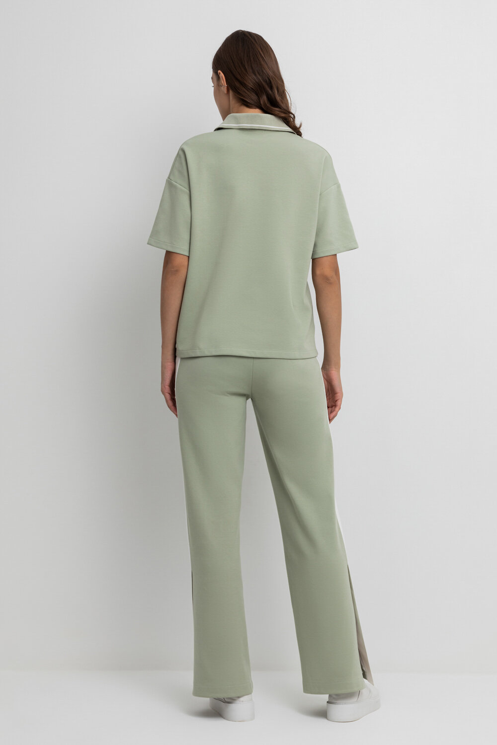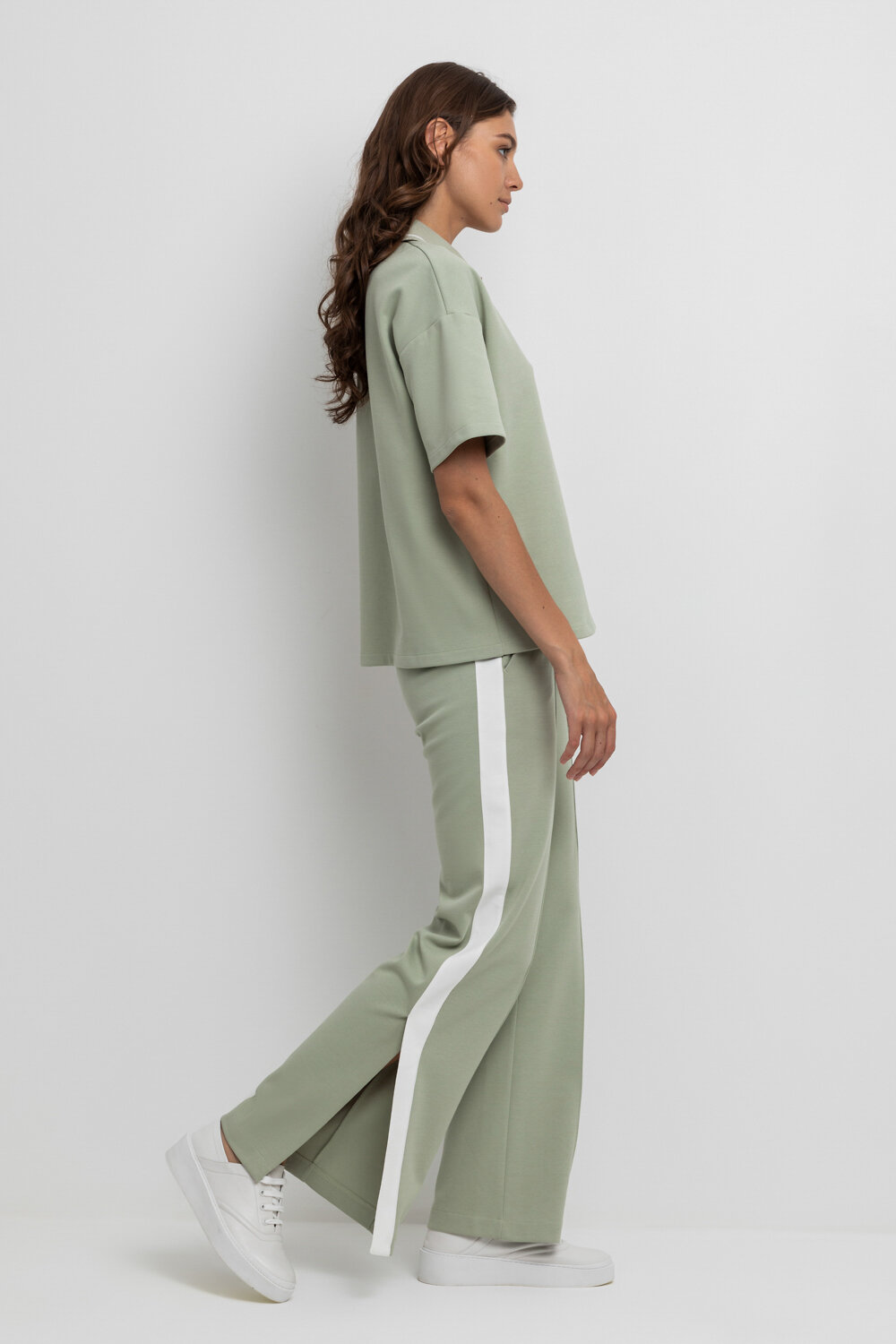 Свободные женские брюки со стрелками и боковыми карманами из плотного гладкого трикотажа интерлок . Модель с контрастными боковыми вставками и разрезами по низу. Застегиваются на молнию и кнопку. Низ обработан плоскими швами . Все трикотажные полотна производятся в соответствии с нормами Швейцарского сертификата ЭкоТекс. Сделано в России