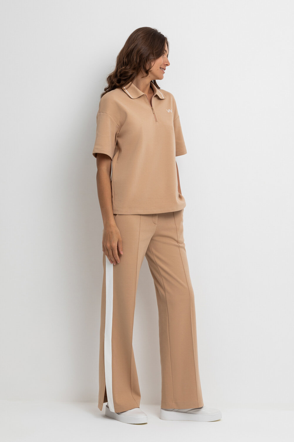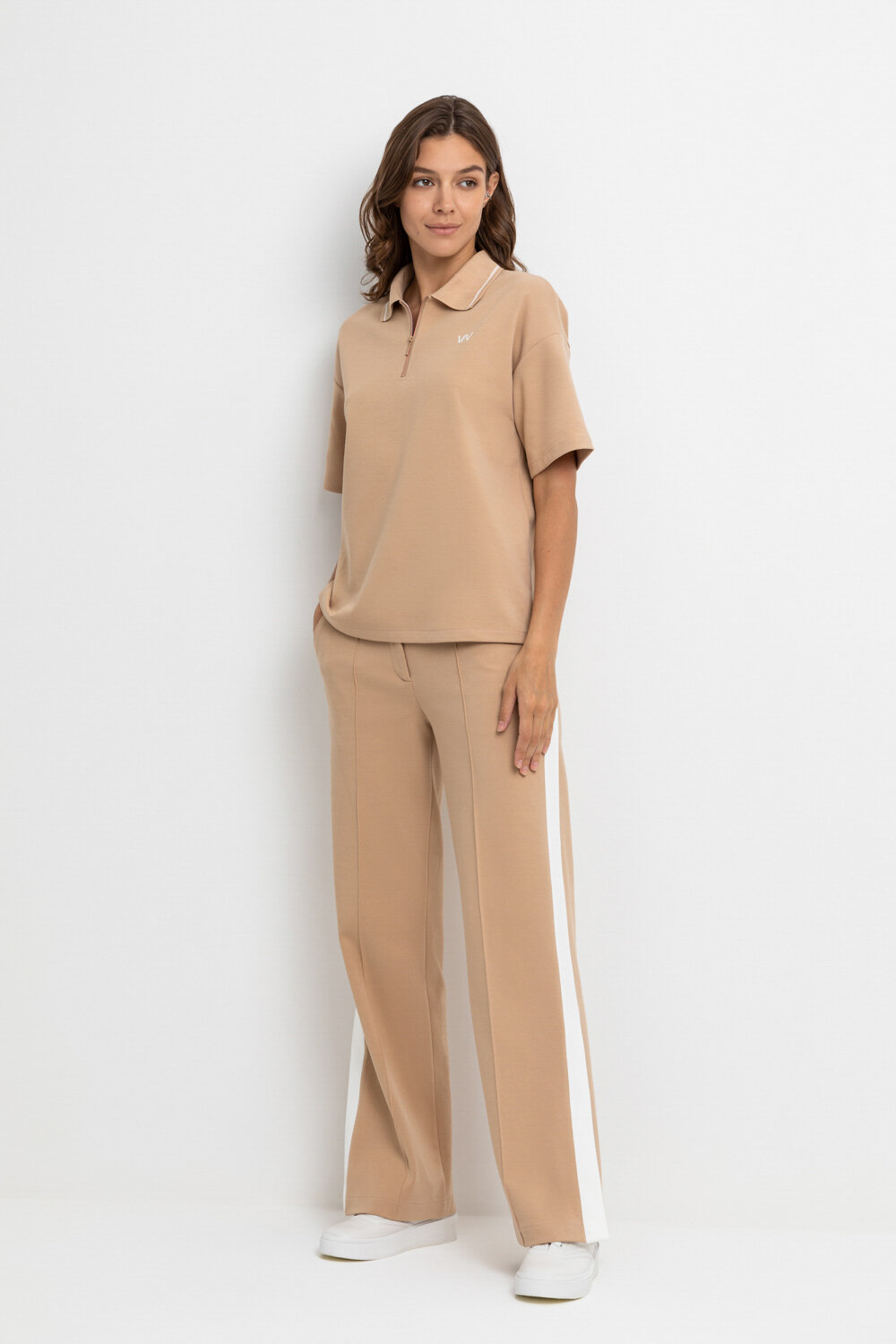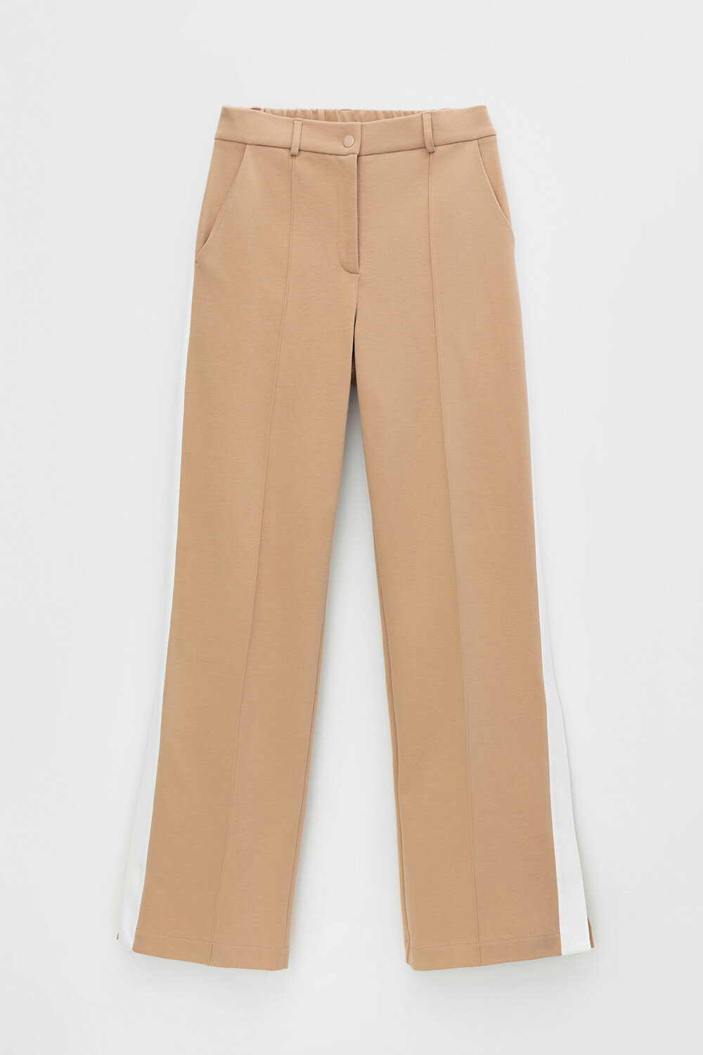 Свободные женские брюки со стрелками и боковыми карманами из плотного гладкого трикотажа интерлок. Модель с контрастными боковыми вставками и разрезами по низу. Застегиваются на молнию и кнопку. Низ обработан плоскими швами. Все трикотажные полотна производятся в соответствии с нормами Швейцарского сертификата ЭкоТекс. Сделано в России