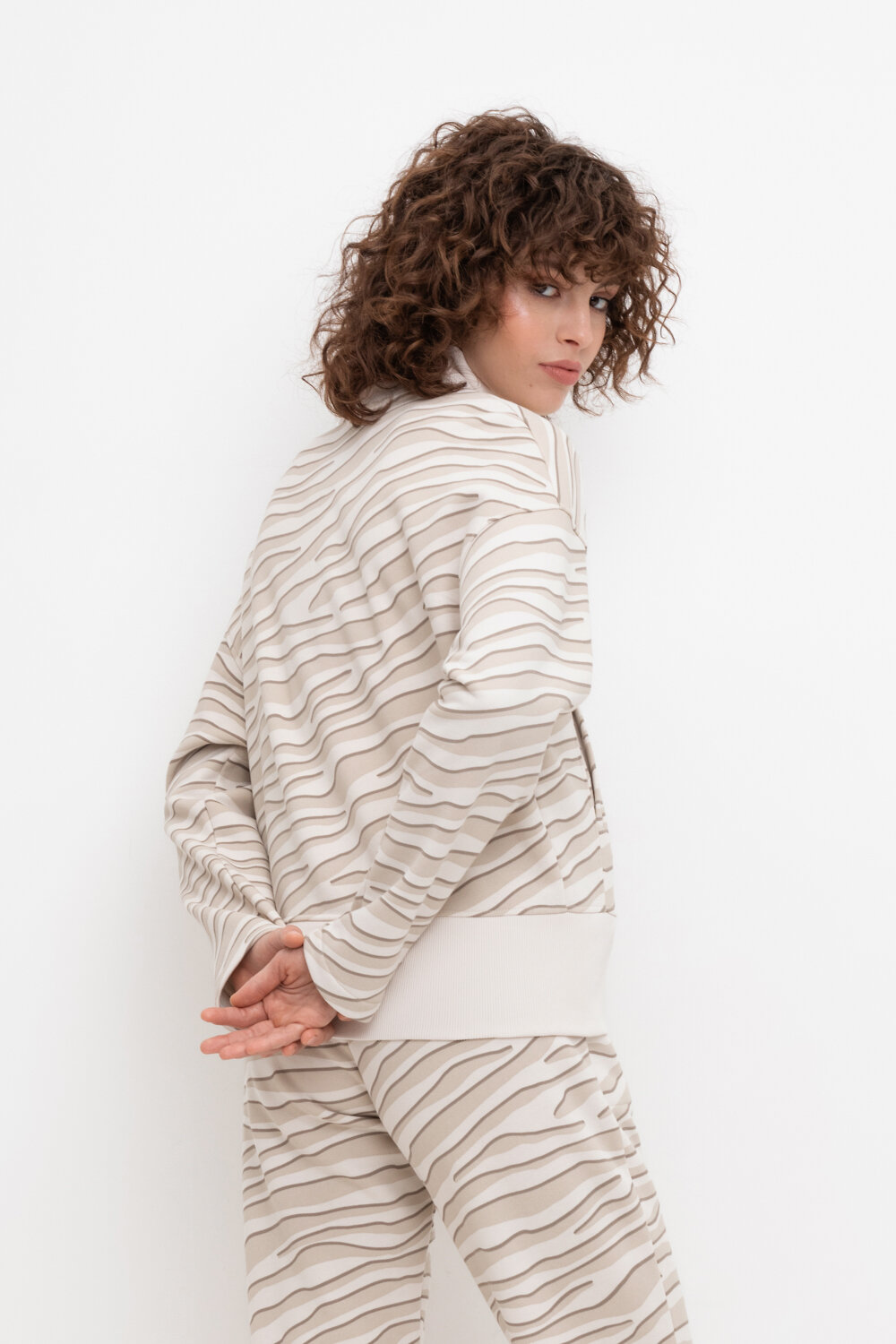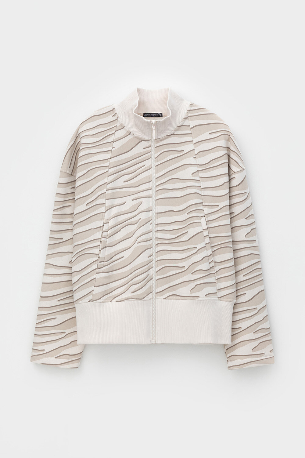 Тёплая трикотажная куртка на молнии с высоким воротником стойкой и широким поясом. Произведена из мягкого набивного трикотажного футера трёхнитки. В составе 80% натурального хлопка и 20% полиэстера, при этом полиэстер ввязан внутрь по особой технологии и не соприкасается с кожей.