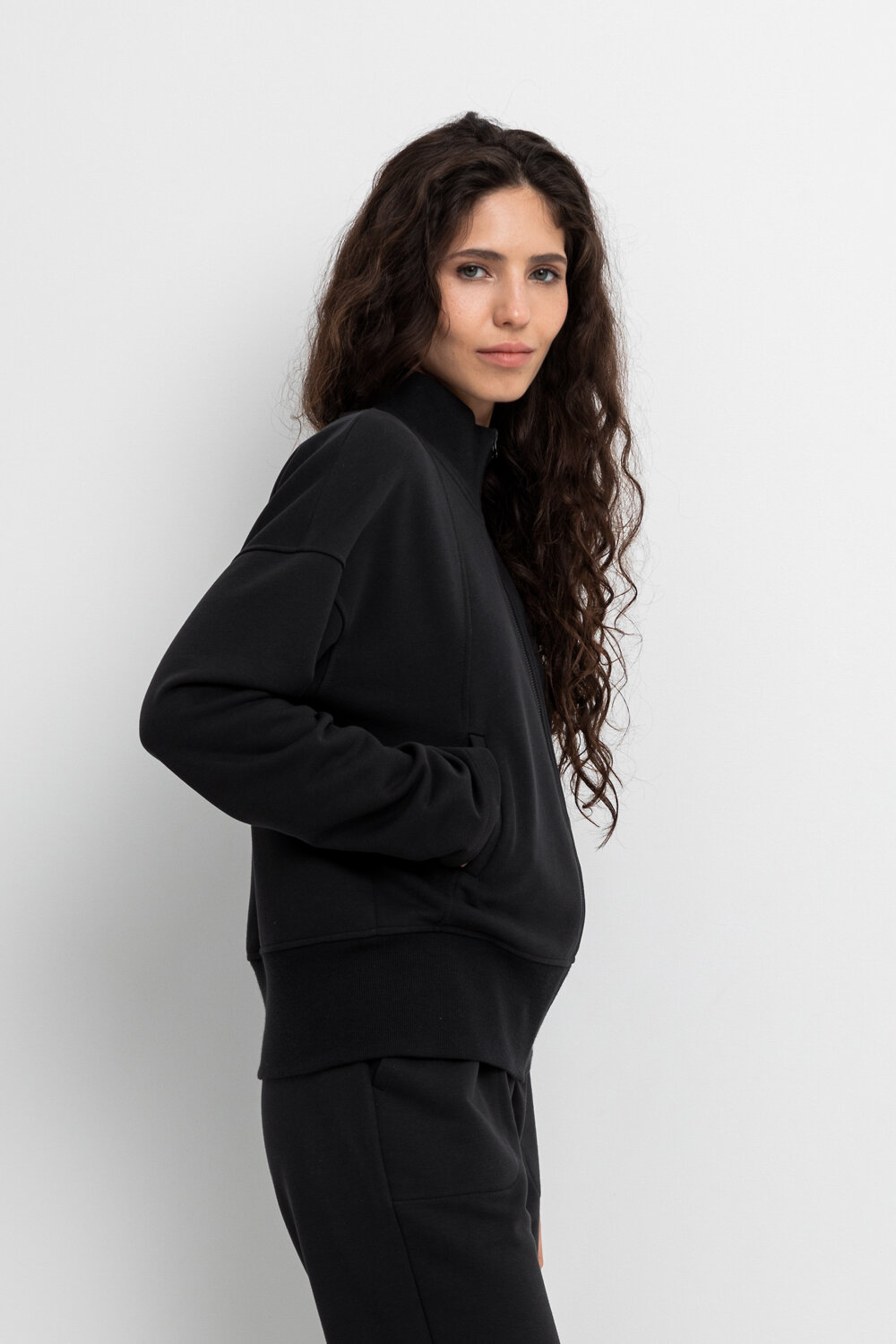 Тёплая трикотажная куртка на молнии с высоким воротником стойкой и широким поясом. Произведена из мягкого трикотажного футера трёхнитки. В составе 80% натурального хлопка и 20% полиэстера, при этом полиэстер ввязан внутрь по особой технологии и не соприкасается с кожей.