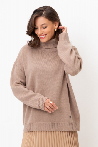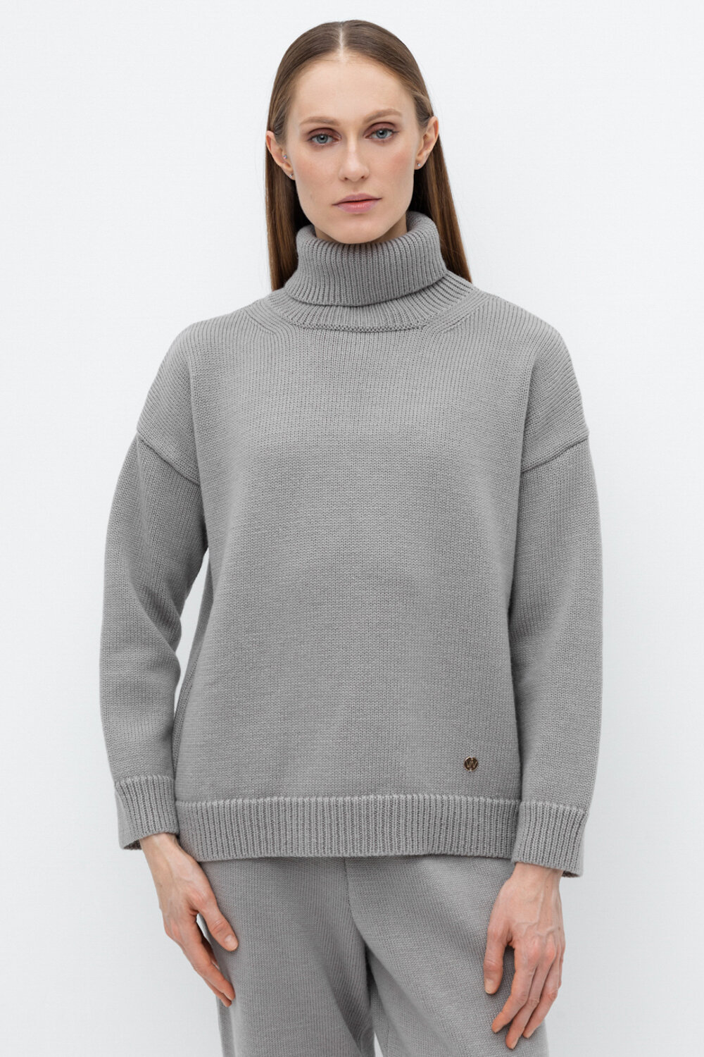 Уютный вязаный джемпер из полушерстяной пряжи. Шерсть в составе сохраняет тепло, а волокна акрила добавляют мягкость и объем. Выполнен гладью. Комфортная длинные цельнокроеные рукава придают изделию объем.